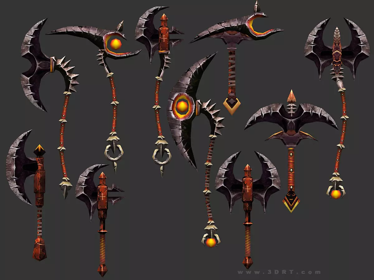Fantasy arms 3d lowpoly axes pack. 10 skin styles. 5 axes, 5 long axes. Normal spec and displacement maps included. 2048x2048 single texture pattern shared for all the weapons. ~200-900 triangles per model. Optimized for mobile applications.