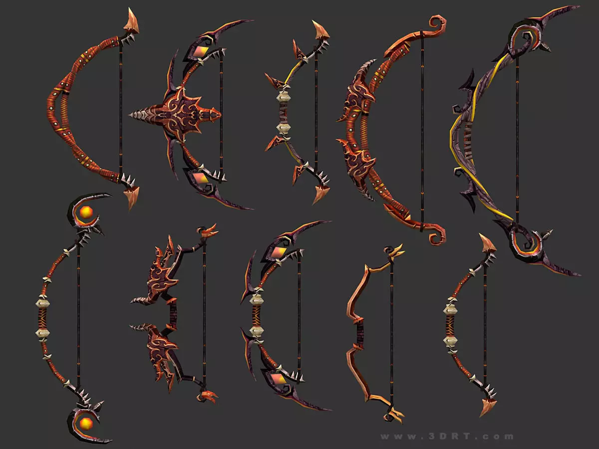Fantasy arms 3d lowpoly bows pack. 10 skin styles. 10 bows meshes. Normal spec and displacement maps included. 2048x2048 single texture pattern shared for all the weapons. ~200-900 triangles per model. Optimized for mobile applications.