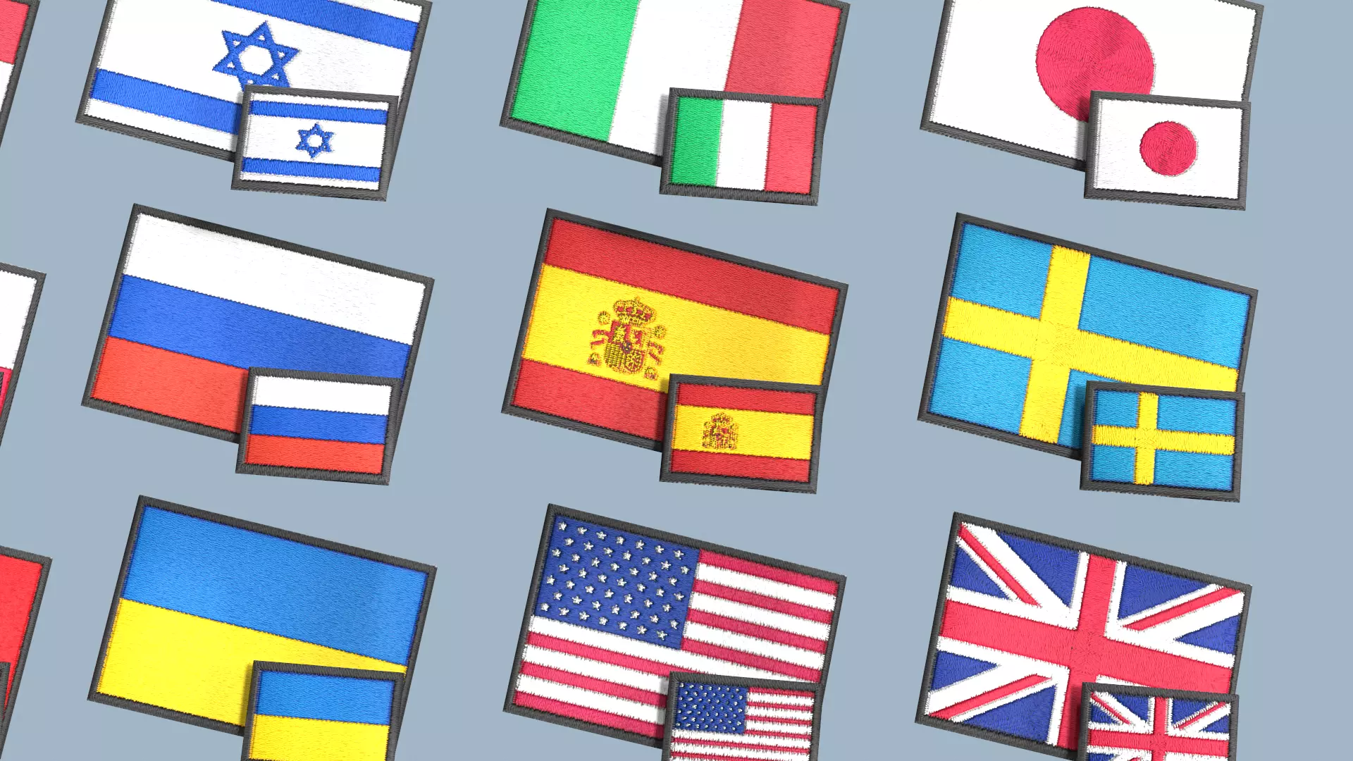 20 embroidered velcro patches of various countries around the world.
