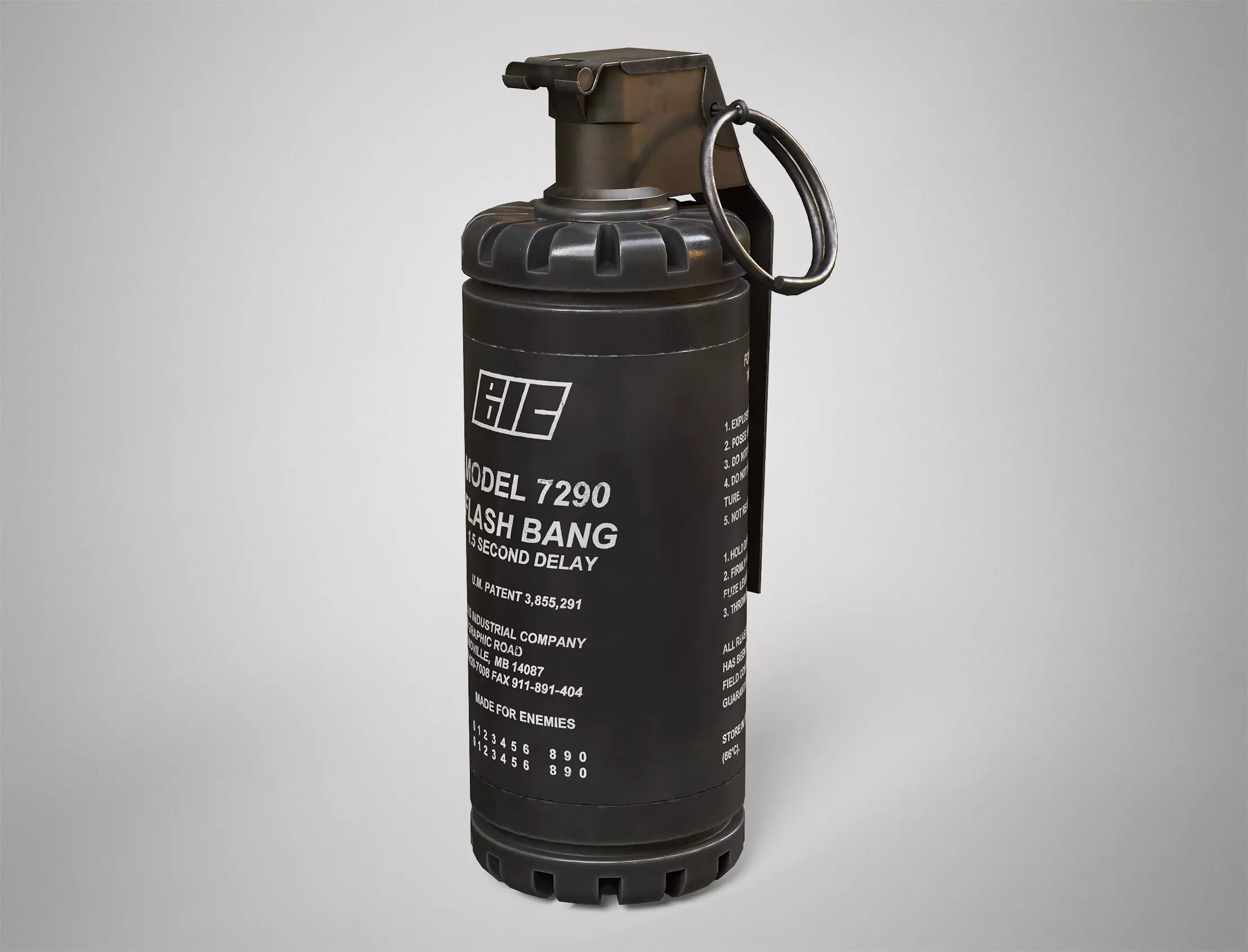 This is a highly detailed, PBR, low-poly, game ready model of a M7290 flashbang hand grenade.This realistic 3D model of a stun grenade is perfect for mmo, fps, shooter, action, rpg, strategy, horror, battle royale, adventure and other game genres. It can also be used in movies, TV shows, video clips, cartoons to extend your filming set. The model was created in Autodesk Maya 2022, textured in Substance Painter and rendered in Marmoset Toolbag 4.
