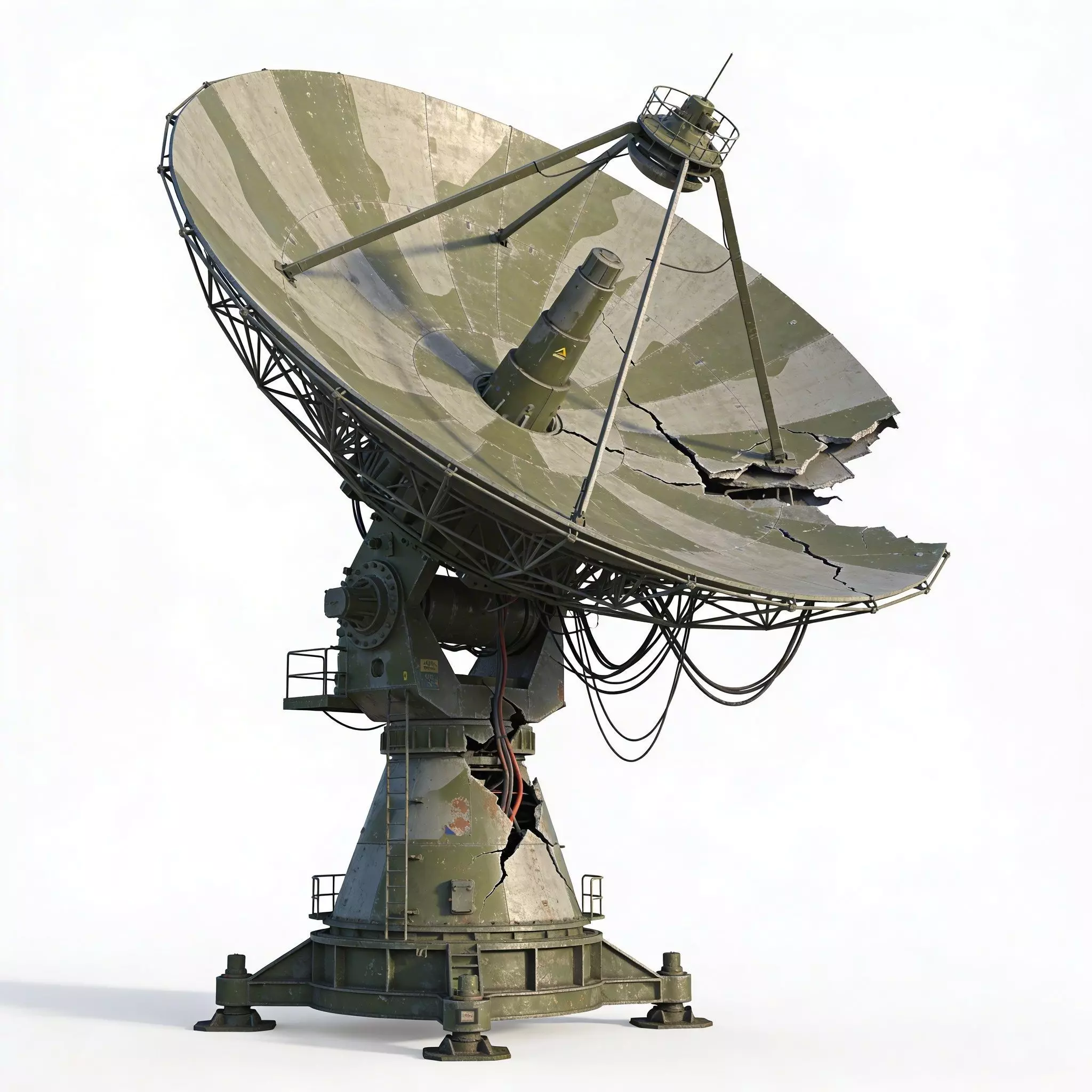 DescriptionThis is a highly detailed 3D model of a battle-damaged military radar system, featuring realistic structural failure and extensive environmental weathering. The asset showcases a large parabolic dish with a distinctive cracked surface and shrapnel punctures, supported by a heavy-duty armored base. The support structure displays deep fractures that reveal internal cabling and mechanical servos, while the entire unit sits on a weathered rotating platform with four outrigger stabilizers. Realistic PBR textures provide a gritty appearance with peeling olive-drab paint, oxidation, and carbon scoring, making it an essential prop for military simulations, abandoned outposts, or sci-fi battlefield environments.