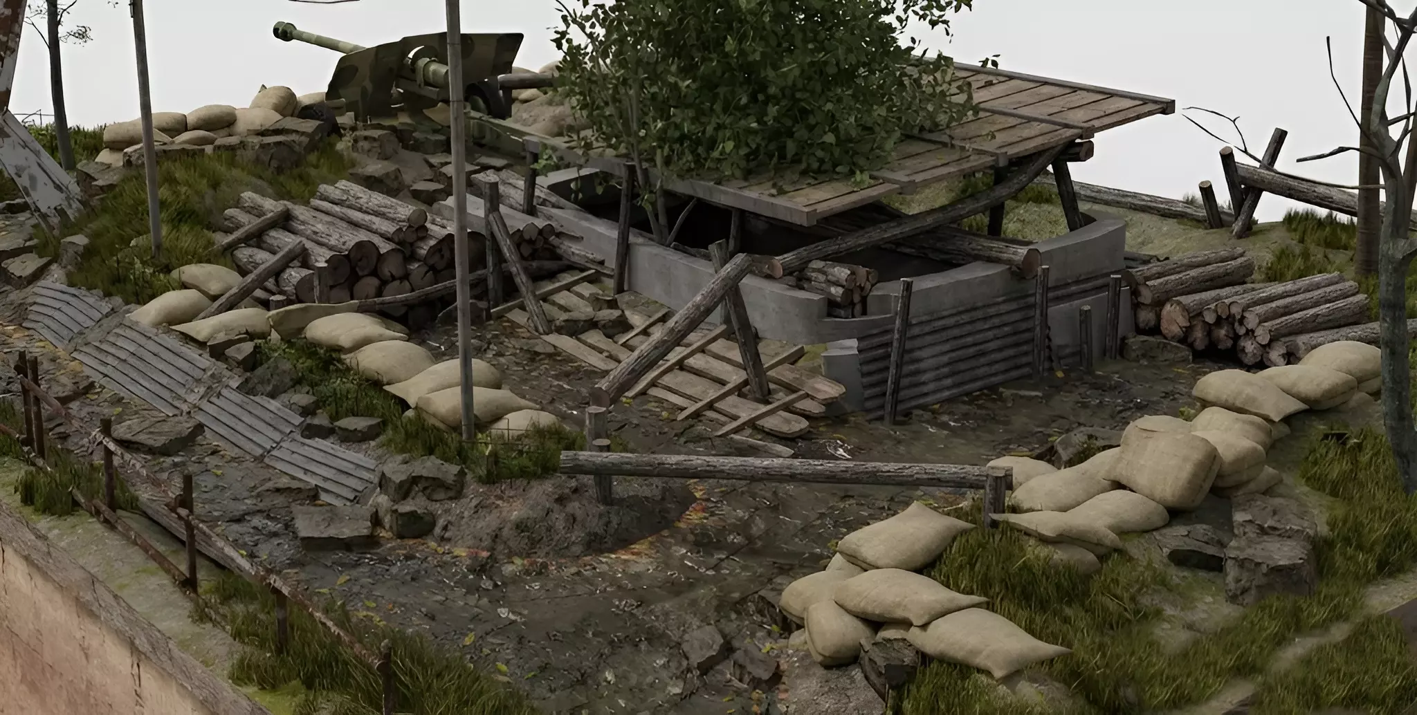 A damaged bunker is built into the terrain and intentionally aged to match the environment. Wooden planks, broken logs, and tree bark pieces are placed around the scene to enhance realism. The ground is covered with grass, bags,soil, stones, and fallen dead leaves, while a mix of trees and palm trees completes the jungle atmosphere.
