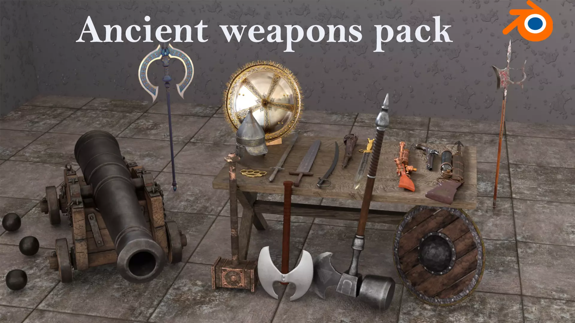 A highly detailed Ancient Weapon Pack 3D model collection, meticulously created in Blender 4.2. This comprehensive pack features a diverse range of historical melee and ranged weapons, ideal for games, cinematics, VFX, animations, VR/AR, and historical visualizations.