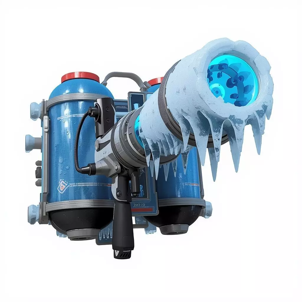 Internal Turbine Glow: The interior of the barrel emits a vibrant cyan light, highlighting the rotating turbine mechanism responsible for projecting the freezing stream.