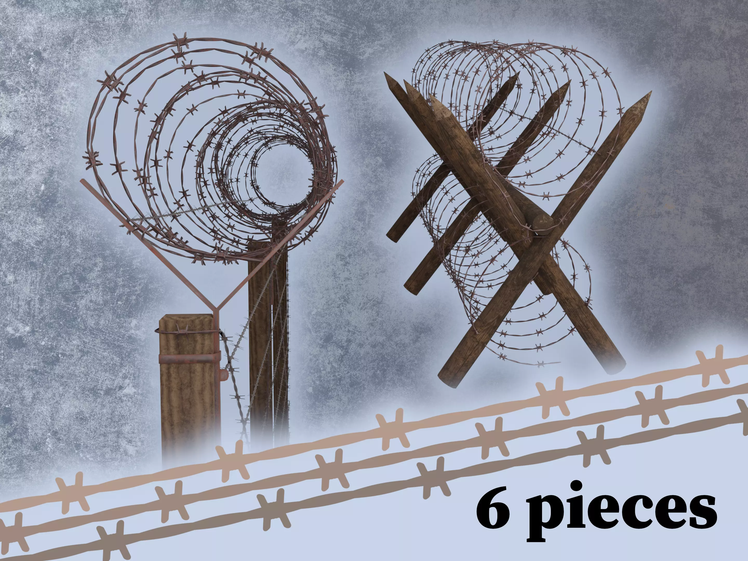 Pack of fences and barricades made of rusty barbed wire, metal and wood. Realistic, detailed look but still maintained semi/low poly count. Simple design, perfect for games and animations. High resolution (4k) textures included.