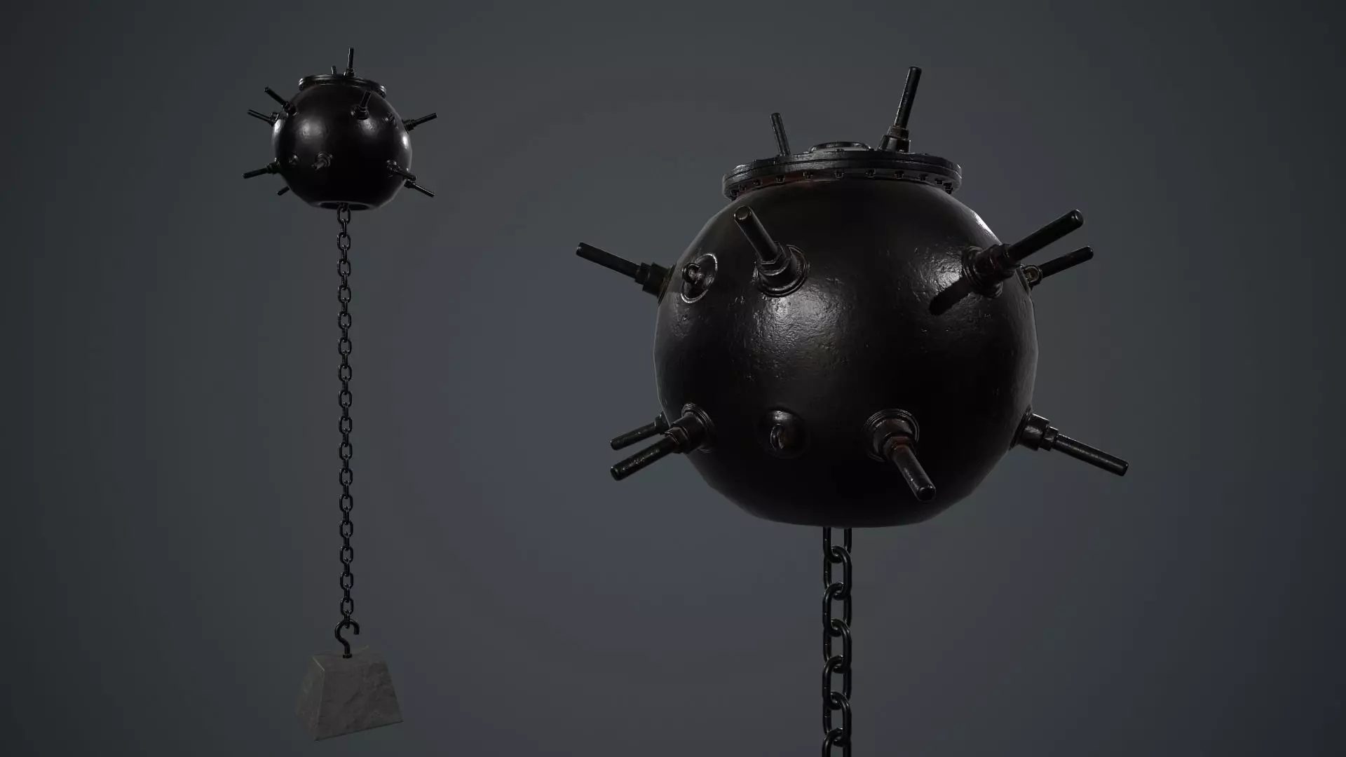 Low poly Naval Mine with PBR Textures. Concrete block and chain are separate objects, so they can be deleted.