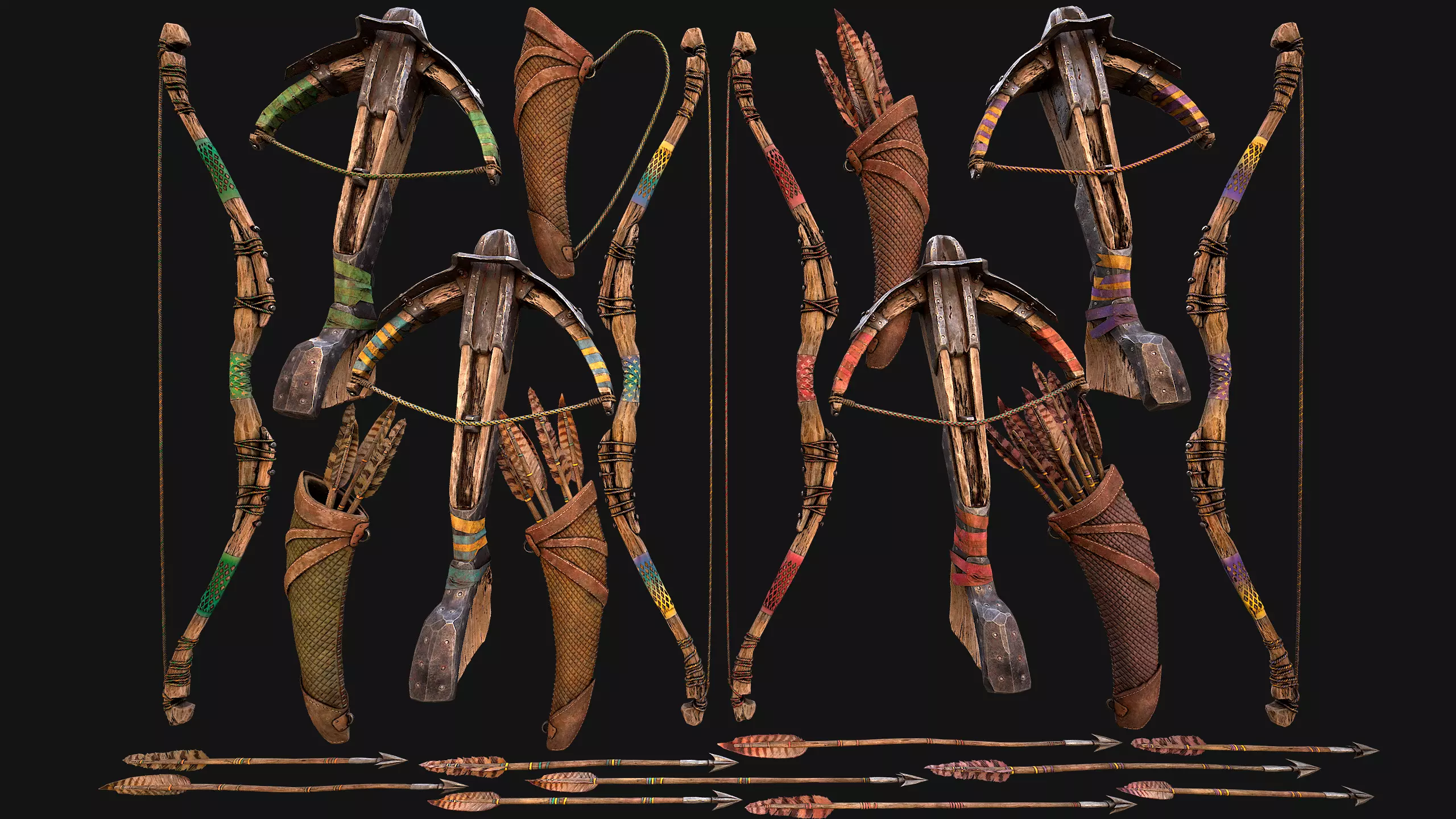 Game ready models .The model contains lods, detailed information on the images.Stylized and detailed Archers Set fully textured, sculpted and rendered with Physical based rendering (PBR) - Shown images have been rendered in Marmoset Toolbag .The set contains 10 models of arrows, a model of an empty quiver, a model of a quiver with 4 arrows, a quiver with 6 arrows, a quiver with 9 arrows and Wooden Bow and Crossbow .The set contains 4 color options.