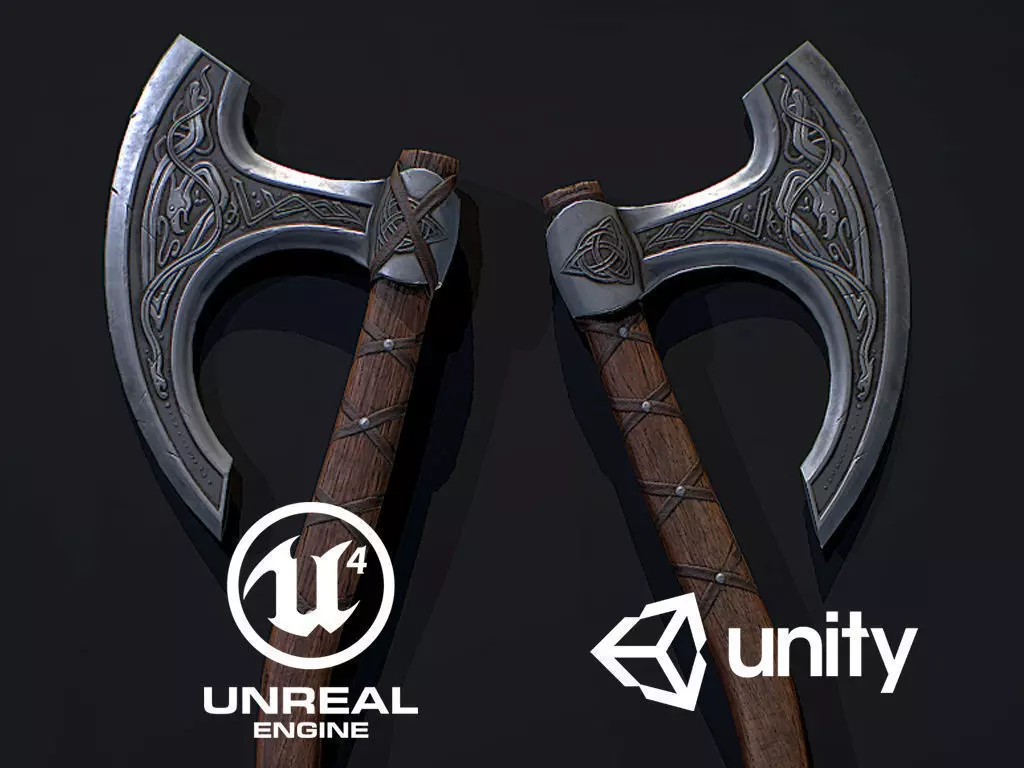 Realtime axe model with celtic or viking styleEfficient Topology and Uv mapPBR textures extracted from Substance painterOpenGl NormalFBXTris : 9584096x4096Base color, Normal Metalic, Roughness