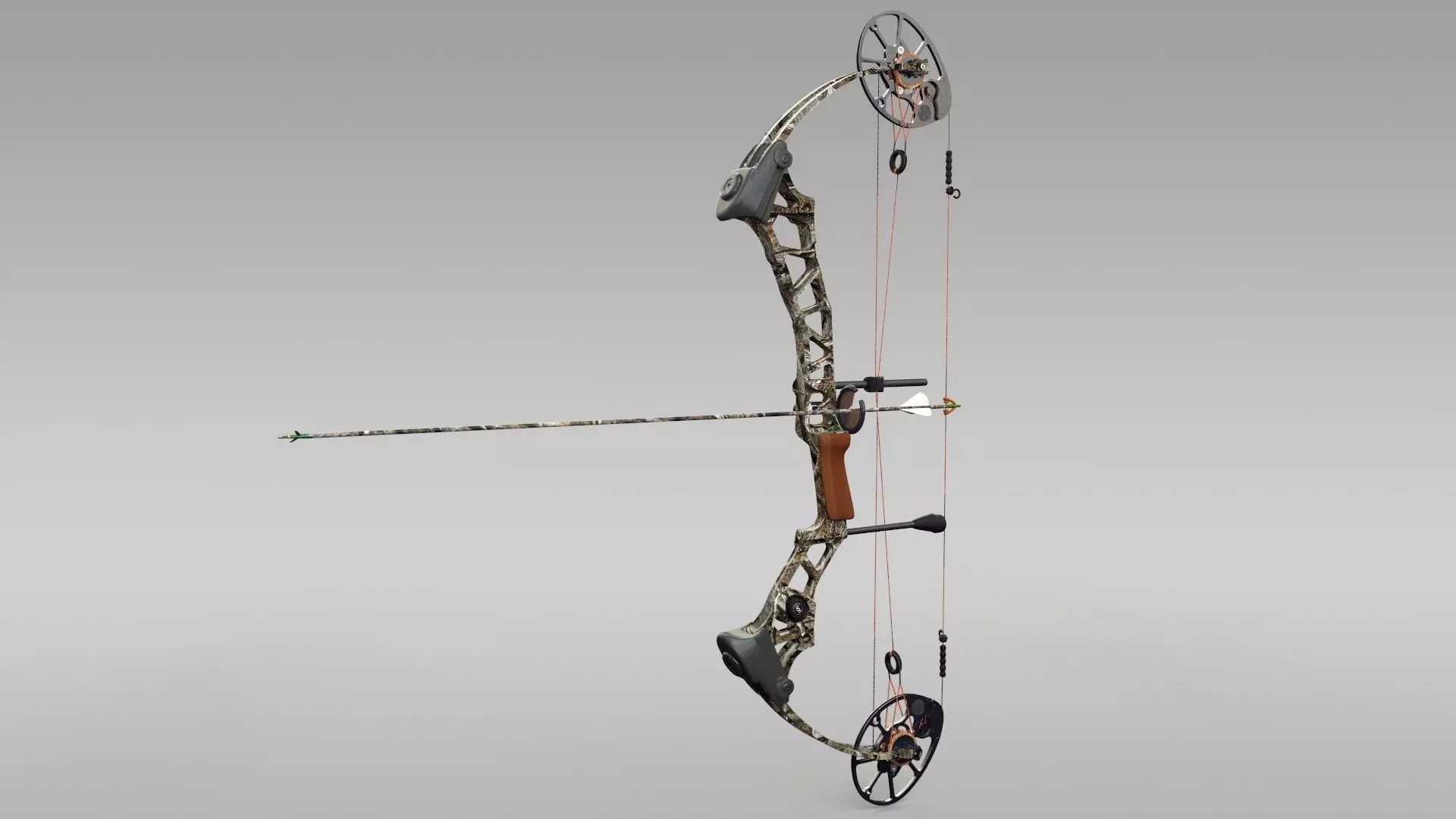 Highly detailed compound bow, modeled to scale including whisker biscuit, d-loop, cam details, harmonic stabilizer, string stop, etc.