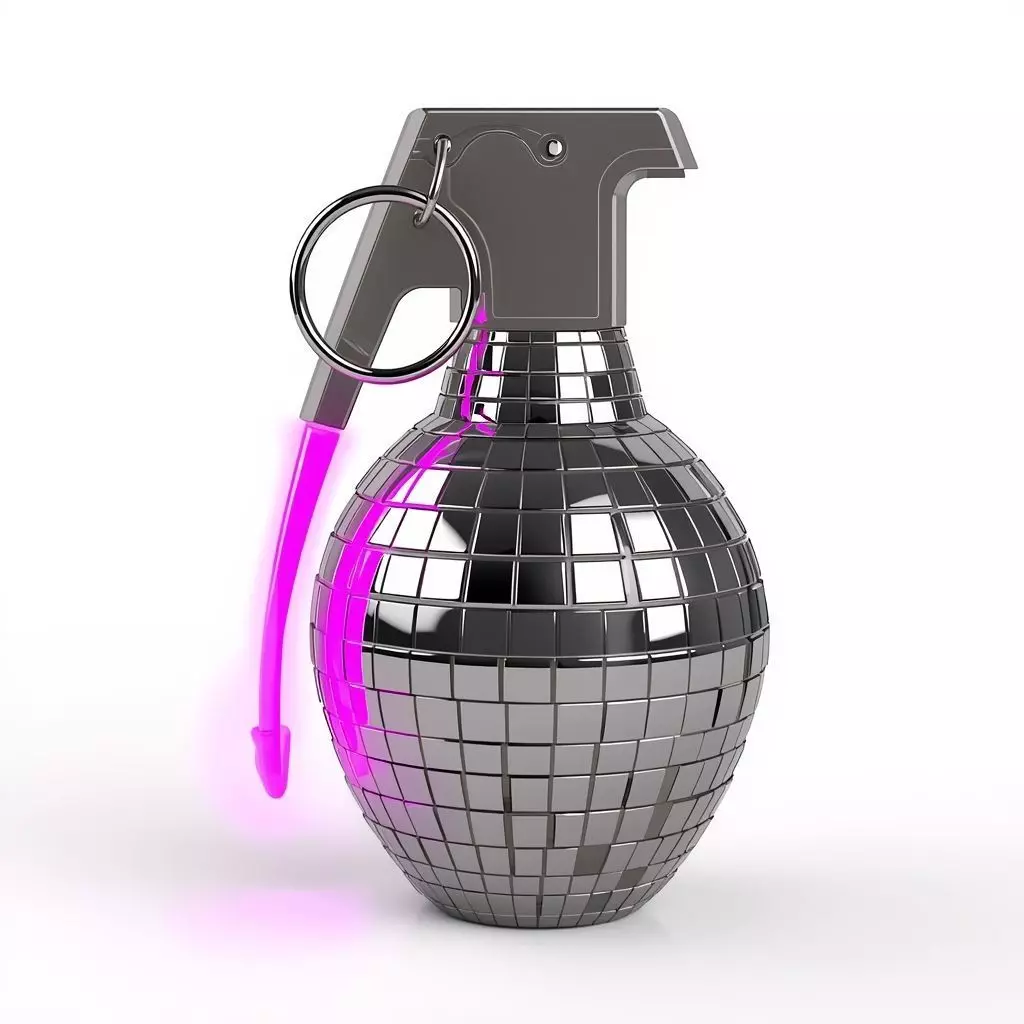Description: Light up the battlefield with the Disco Inferno, a grenade that promises a groovy demise. Designed for stylized shooters, battle royales, or rhythm-based action games, this weapon adds a dazzling flair to combat. The explosive casing mimics a classic disco ball, covered in reflective mirror tiles that catch the light. Instead of a standard fuse, it features a pulsating neon pink igniter, suggesting that the resulting explosion will be as colorful as it is deadly.
