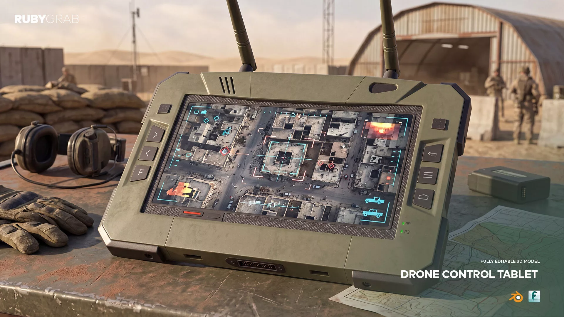 This is a highly detailed 3D model of a Drone Control Tablet, designed for use in military and tech-related projects. The package includes high-quality textures, as well as .blend and .fbx files for easy integration and customization in various workflows.