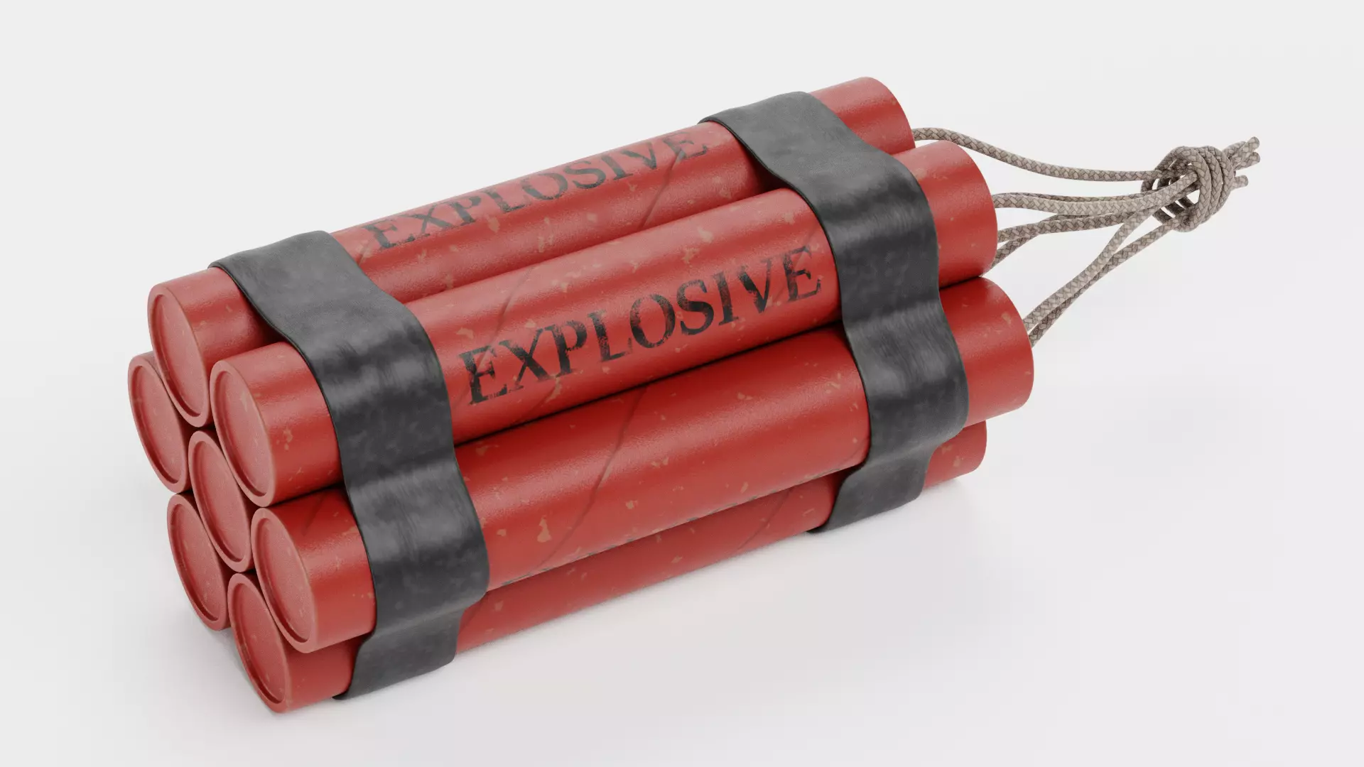 A larger dynamite bundle combining seven sticks into a tightly taped unit, forming a dense and visually dominant explosive setup. The grouped fuses converge into a single tied end, creating a clear focal point that naturally guides attention and reinforces the sense of a prepared ignition point. Labeled wrapping (“Explosive”) and structured binding add to the overall readability, making the asset work effectively in both close-up detail shots and wider compositions.