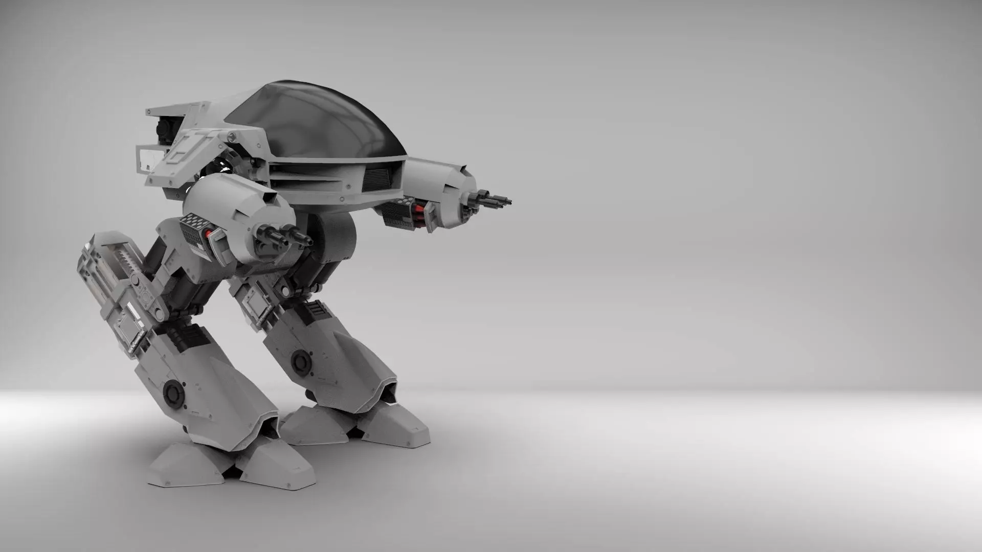YOU HAVE THIRTY SECONDS TO COMPLY. This is a model of ED209 from the Paul Verhoeven classic, Robocop. The good version not that new one... This model was made in 3ds Max using a collection of standardised parts and using research from the original build of the physical model including references for car parts and for rear driven assemblies - ED209 is not a chicken walker robot even though it may look like one, instead it has a sliding reverse leg for lift and placement that makes is fairly unique.The model is not textured - instead, the model is pre-coloured on the mesh so that it can be allocated textures in any procedural renderer, the examples I am using are rendered in Keyshot which took approximately 10 minutes to do from importing the model.If you would like I will separately send you the entire video on how this piece is made at no extra cost if you purchase this model. The video set with full audio is 40 hours and includes creation of a low polygon model which is unwrapped and normal mapped using the high polygon model. I also show how to create a full rig for it, how it can be animated and how to put the ED209 model into the Unreal Engine (it was actually the older UDK however it still works rather unsuprisingly on the UE4 engine. )I will be updating this product with more files including low poly and the rigged max files and so anyone who purchases this will get those too at no extra cost.