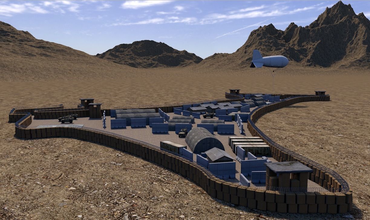This is a Forward Operating Base (FOB) that I have worked on before. Location is undisclosed but this resembles most all other small FOB's/COP's/COB's that operate in many areas of the world, mostly known recently for Afghanistan and Iraq. This model contains several objects that are meant for high level rendering on close up scenes or can used as a distant base.