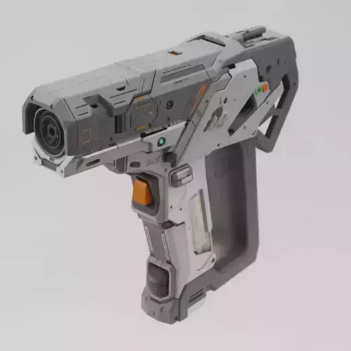 The design highlights a robust, compact chassis featuring a large front-facing optical lens, an ergonomic rear grip with a textured thumb rest, and an integrated orange tactical trigger. Its body includes complex mechanical detailing such as ventilation ports, mounting rails, and recessed sensor clusters. Engineered with an ultra-efficient low-poly count under 5,000 polygons, this asset is perfectly optimized for real-time game engines, VR/AR applications, and high-performance mobile environments.