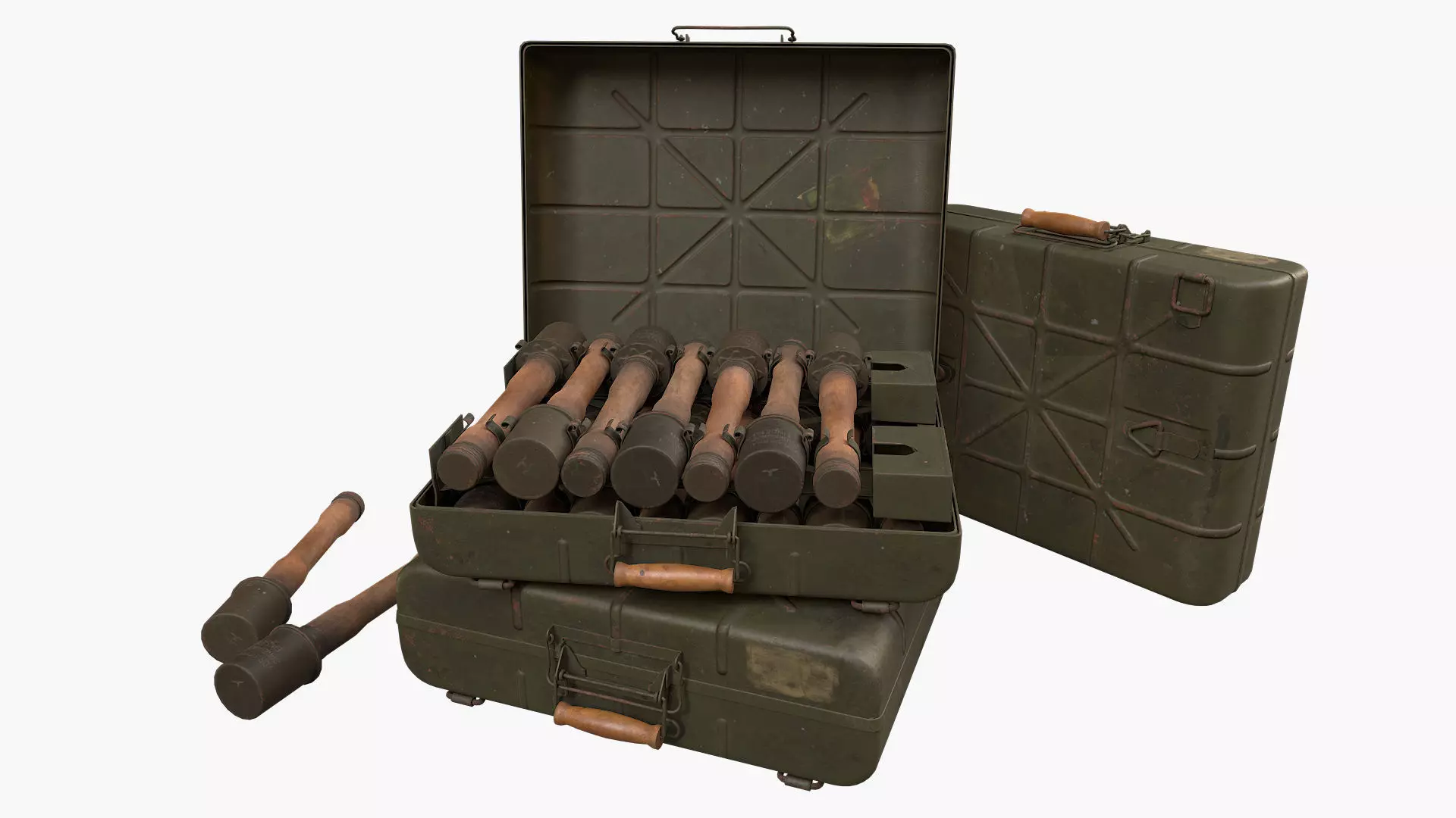 It's a game ready set with Low Poly 3D models of WWII German M24 stick grenade in the original Metal Case.