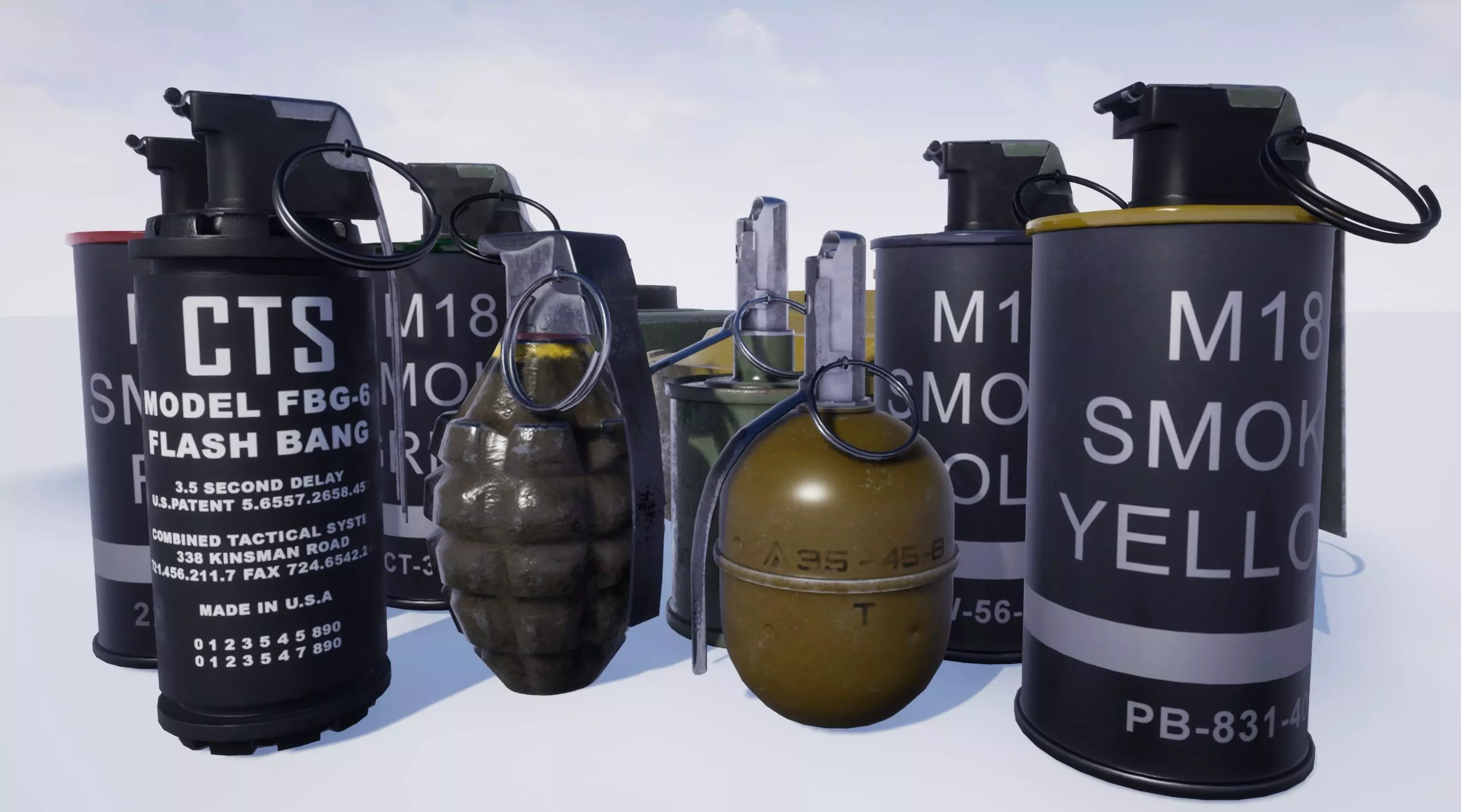 Package includes: MK2,RG42,RGD5,M15,TM57,M18 Red,M18 Yellow,M18 Green,M18 Violet,Flesh grenade.Textures: PBR MetalRough, Unity Pack.Texture Sizes:2048x2048 (in ZIP)Number of Meshes: 10Number of Textures: 40