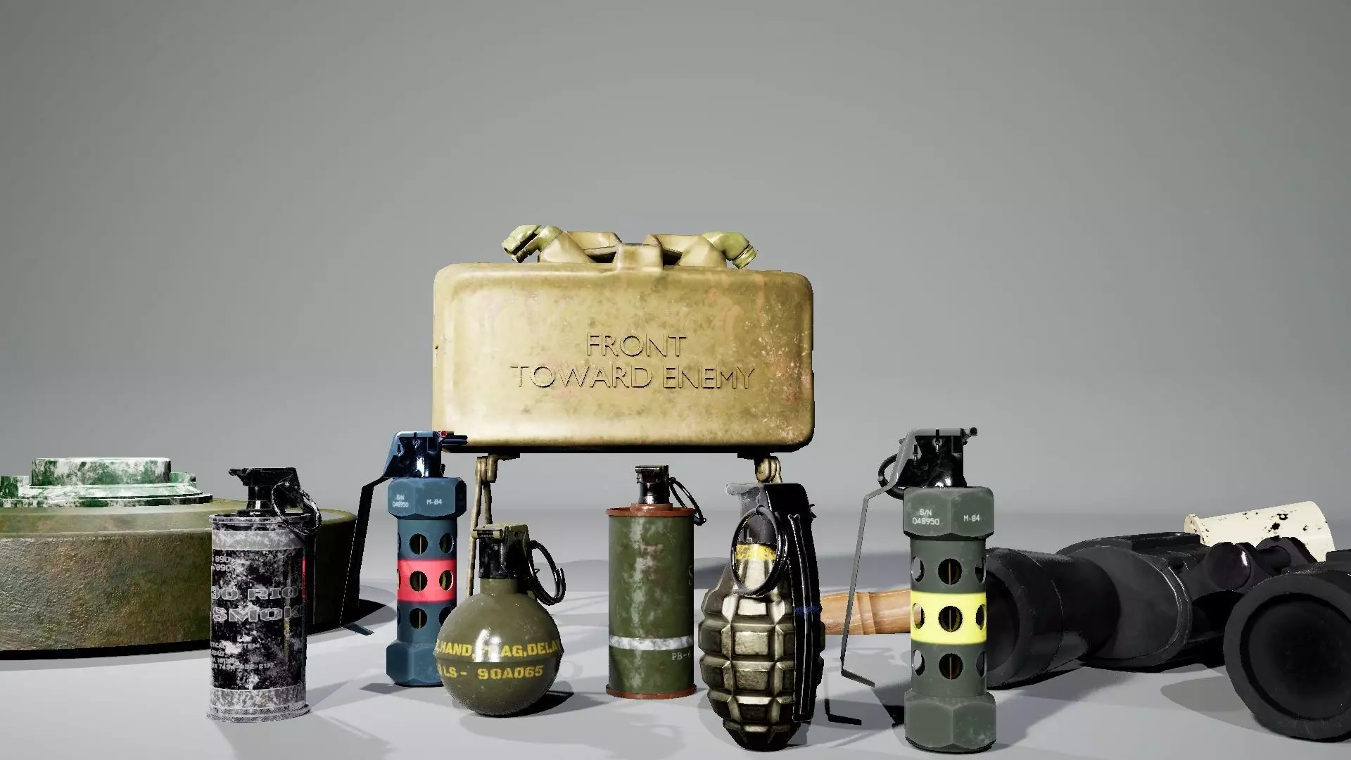Landmine (only rigged)Smoke Red (detachable)Smoke White (detachable)Stick grenade (detachable)Stun M84 (detachable)Grenade MKII (detachable)Grenade M67 (detachable)Flashlight (detachable)Claymore Mine (only rigged)Binoculars (only rigged)