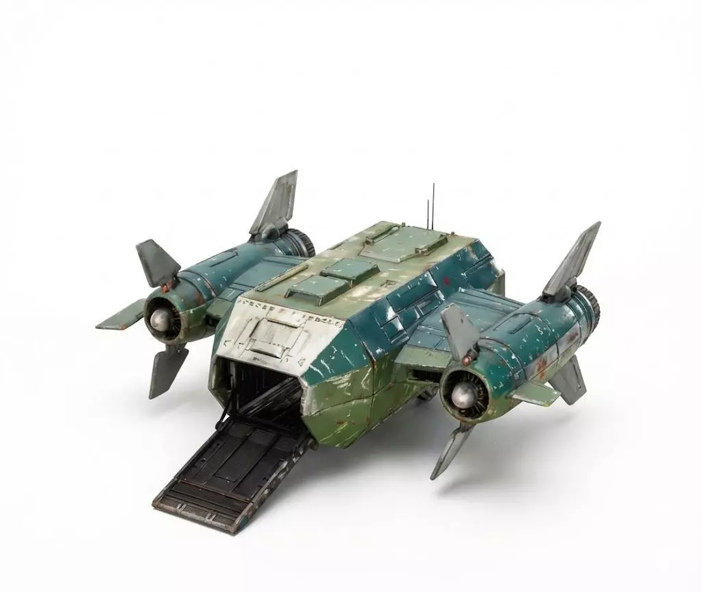 The Overall Concept This asset is the quintessential battle bus for a sci-fi setting. It is a heavy-duty troop and cargo transport designed for vertical take-offs and landings (VTOL), reminiscent of iconic dropships from classic space marine media.