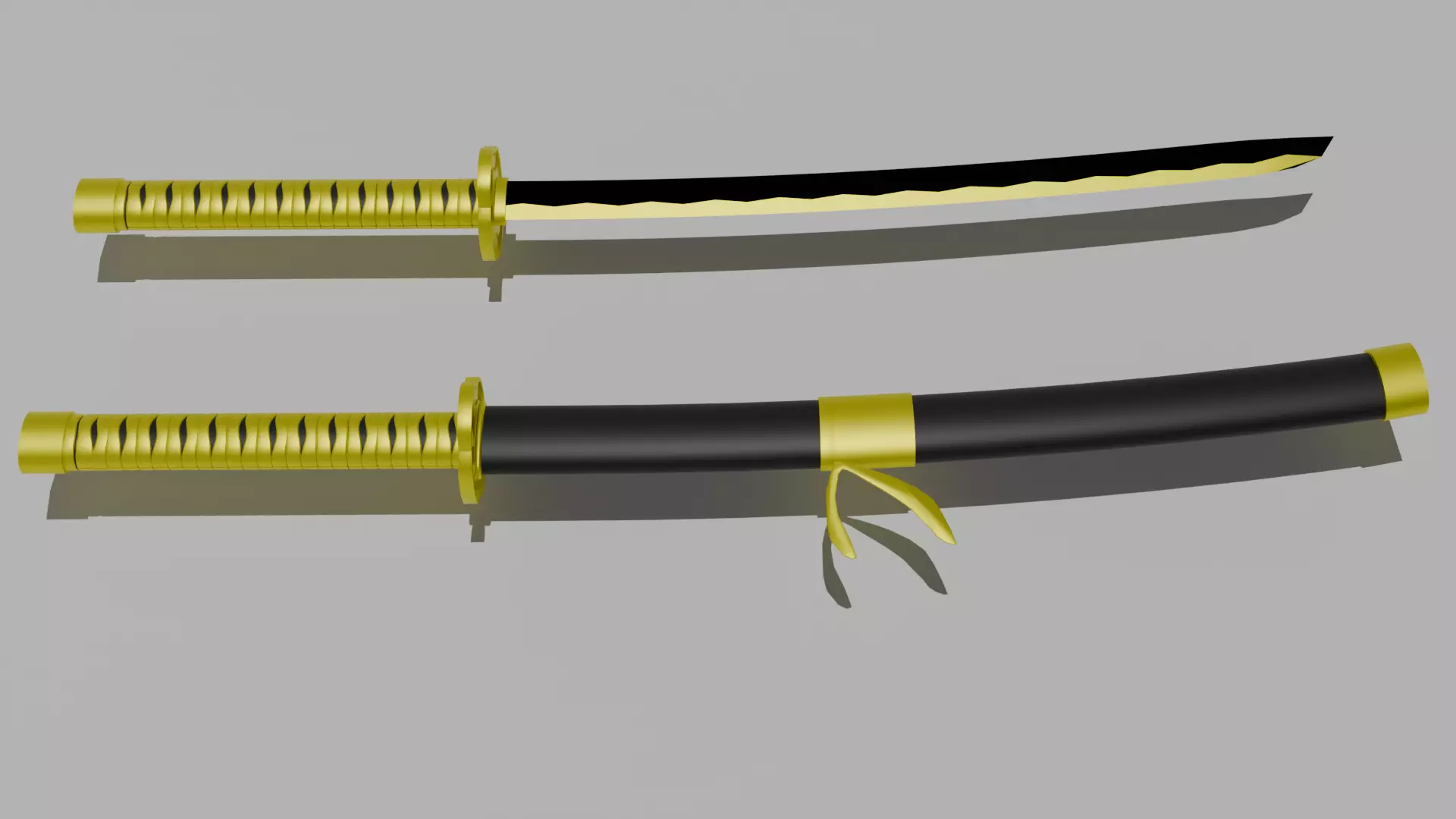 Este modelo 3D representa una katana de diseño elegante y moderno, con un acabado metálico en tonos dorado brillante y negro mate.