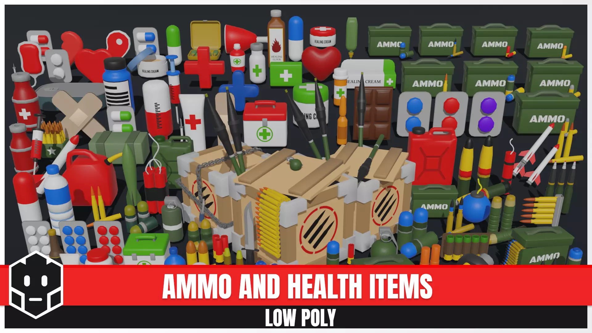 A collections of Ammo and Health consumables items in a low poly stylized style for a Third Person Shooter or FPS game.