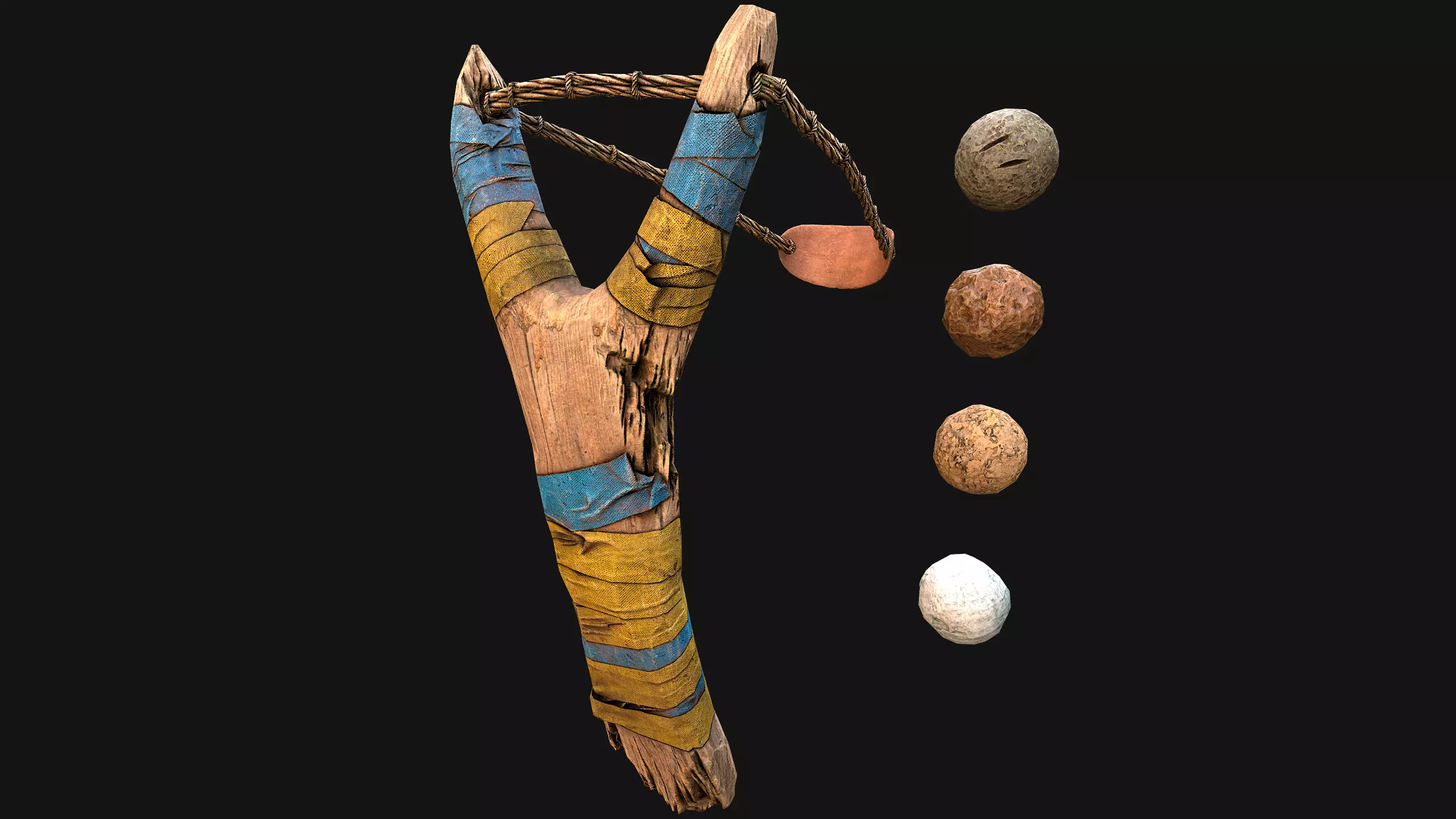 Game ready models .The models contains lods, detailed information on the images.Stylized and detailed Medieval Wooden Slingshot fully textured, sculpted and rendered with Physical based rendering (PBR) - Shown images have been rendered in Marmoset Toolbag .The set contains: Wooden Slingshot,4 pebbles for a slingshot .