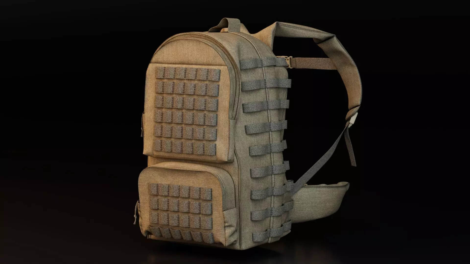 The design is inspired by real-world military rucksacks with modular MOLLE (Modular Lightweight Load-carrying Equipment) webbing, multiple storage compartments, tactical padding, and heavy-duty zippers. The backpack is modeled with precision to capture every functional detail—from webbing straps to seam stitching, making it highly suitable for close-up renders as well as real-time applications.