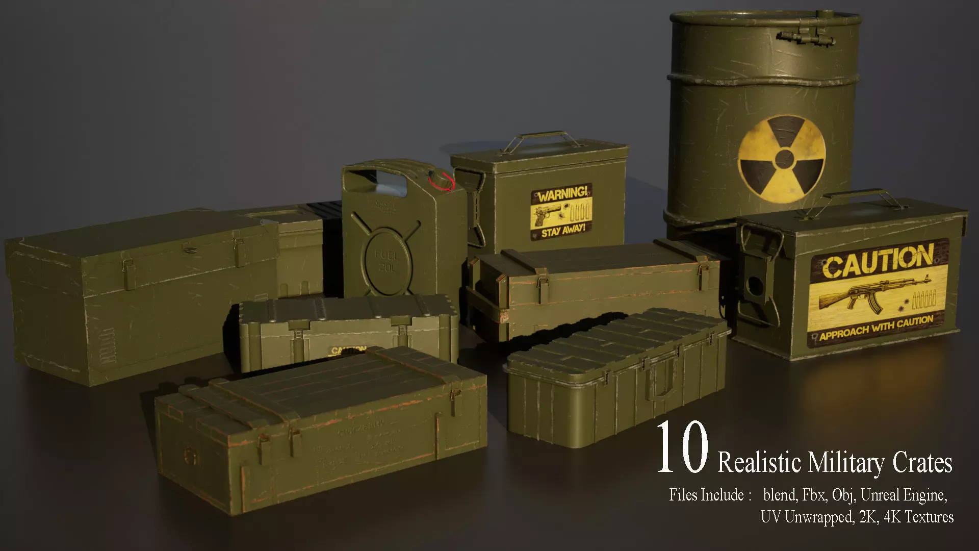This pack includes 10 unique realistic military storage crates designed for modern game environments such as military bases, army camps, supply depots, warehouses, and battlefield scenes.