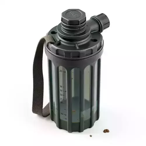 This is a highly detailed, game-ready 3D model of a military-grade field water filter bottle or canteen, perfect for a wide range of digital applications. The model showcases a robust, tactical design with a dark green, rugged exterior and a transparent inner section featuring clear measurement markings. Accentuating its authenticity, subtle details of wear, dirt, and scuff marks have been meticulously integrated, giving it a realistic, used appearance. A practical fabric strap is included, enhancing its portability and realism. This asset is ideally suited for integration into first-person shooter (FPS) games, survival games, adventure titles, and other real-time interactive environments where realism is paramount. Beyond gaming, it serves as an excellent prop for architectural visualizations, detailed environment renders, augmented reality (AR) and virtual reality (VR) experiences, or compelling digital art compositions. The model boasts clean, optimized topology and is fully UV unwrapped, making it ready for immediate use. High-resolution Physically Based Rendering (PBR) textures are included, ensuring photorealistic rendering across various lighting conditions and game engines. Supporting multiple industry-standard formats, this model is available in GLB, OBJ, STL, ABC, DAE, FBX, USD, and PLY. Its efficient polygon count makes it suitable for real-time applications without sacrificing visual fidelity, while the high level of detail also allows for high-quality static renders. This versatile asset provides a reliable and visually striking component for any project requiring realistic military or outdoor utility gear.