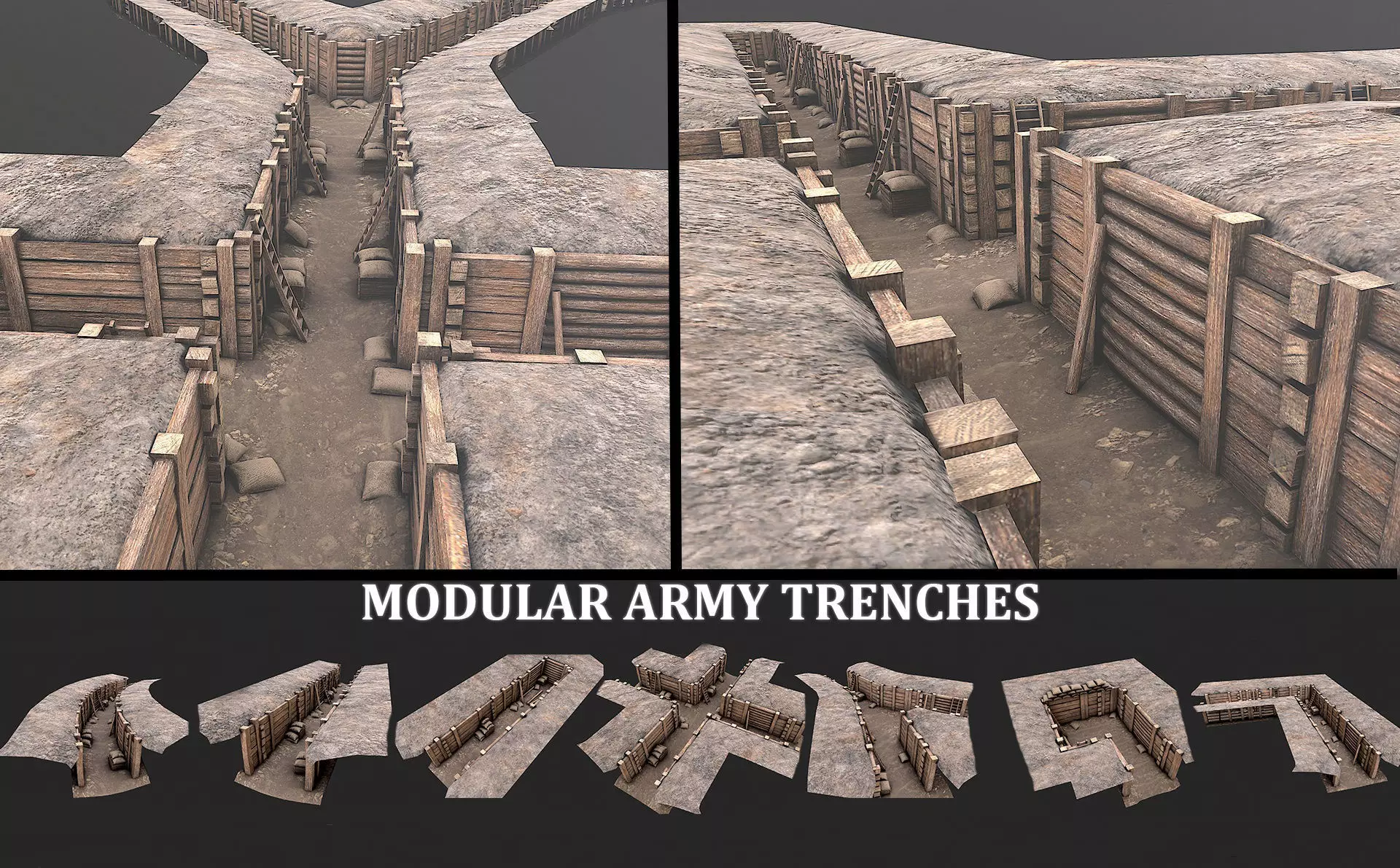 Modular Low Poly PBR Army Trenches Low-poly 3D model