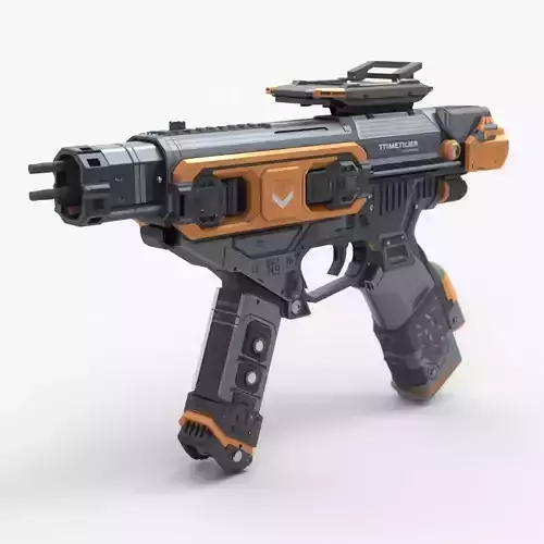 The design highlights a robust modular chassis consisting of an ergonomic pistol grip with integrated sensor arrays, a top-mounted tactical optic or scanner, and a specialized triple-pronged emitter tip at the front. Its body features complex surface detailing, including ventilation ports, recessed panel lines, and manufacturer branding for enhanced immersion. Engineered with an ultra-efficient low-poly count under 5,000 polygons, this asset is perfectly optimized for real-time game engines, VR/AR applications, and high-performance mobile rendering.