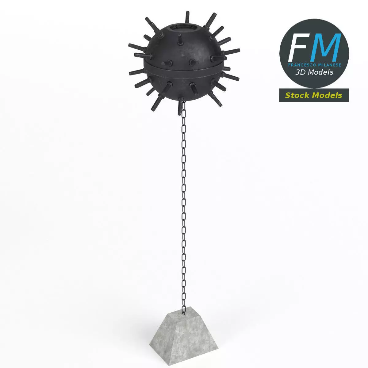 Naval mine 3D Model. 3 individual objects (naval mine; modular chain; concrete --- you can easily remove or modify them; for example, you can create more copies of the chain), each one with its own non-overlapping UV Layout map, Material and PBR Textures set. Production-ready 3D Model, with PBR materials, textures, non overlapping UV Layout map provided in the package.