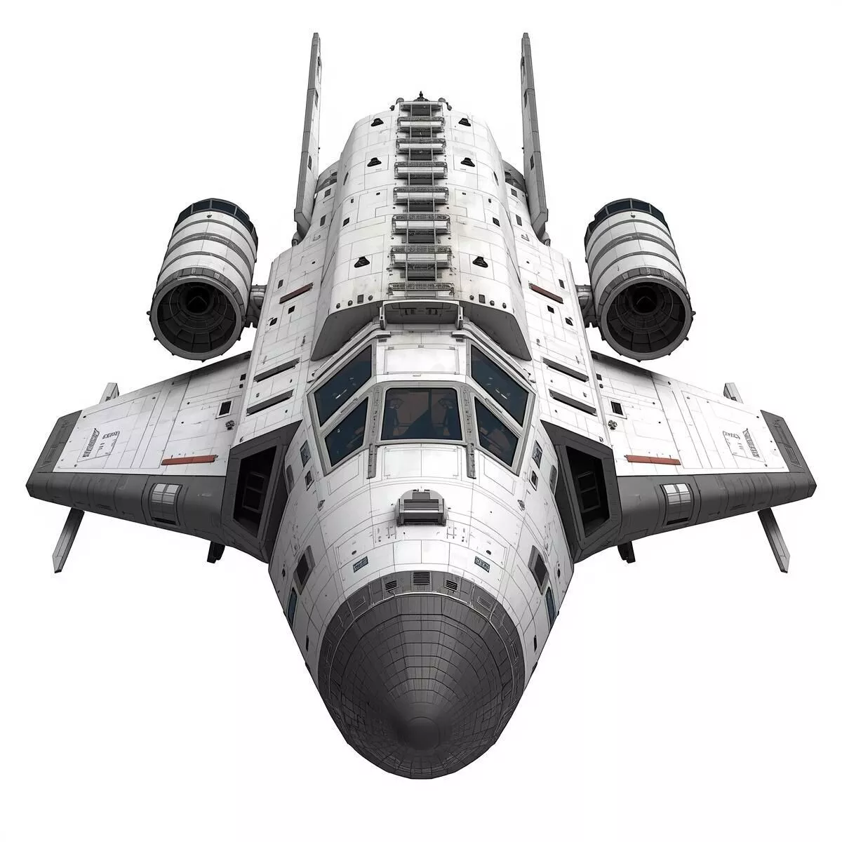 The realistic sci-fi transport shuttle is a highly detailed 3D asset designed for deep space exploration, smuggler scenarios, or industrial sci-fi game environments.