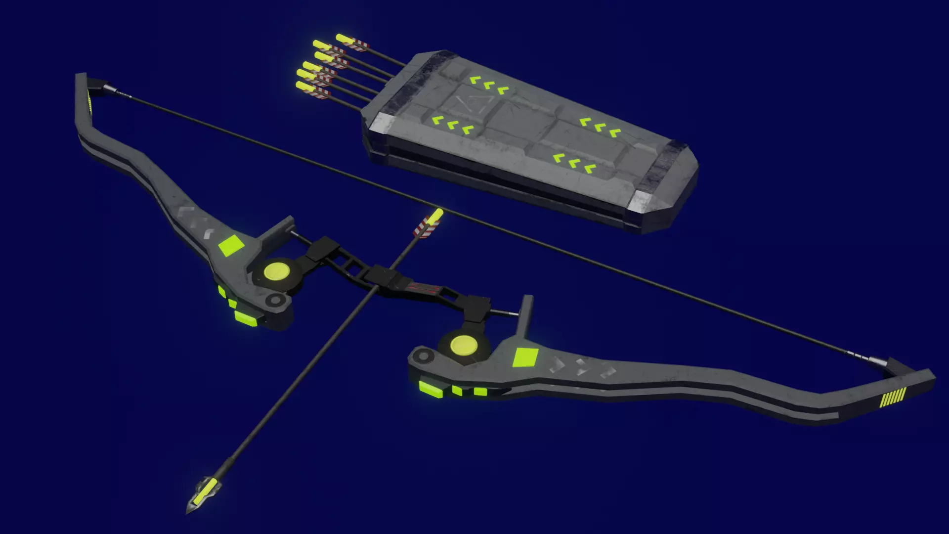 Low poly model of Sci fi bow with arrow and quiver