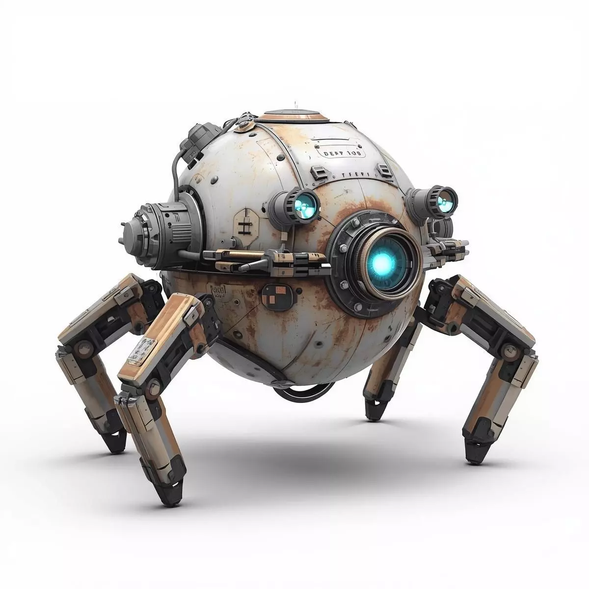Tags3d model maintenance drone sci-fi robot spherical drone game ready prop industrial utility glowing blue eyes weathered metal realistic rust futuristic machine space station asset repair bot mechanical legs isolated asset pbr materials orbital drone tech prop