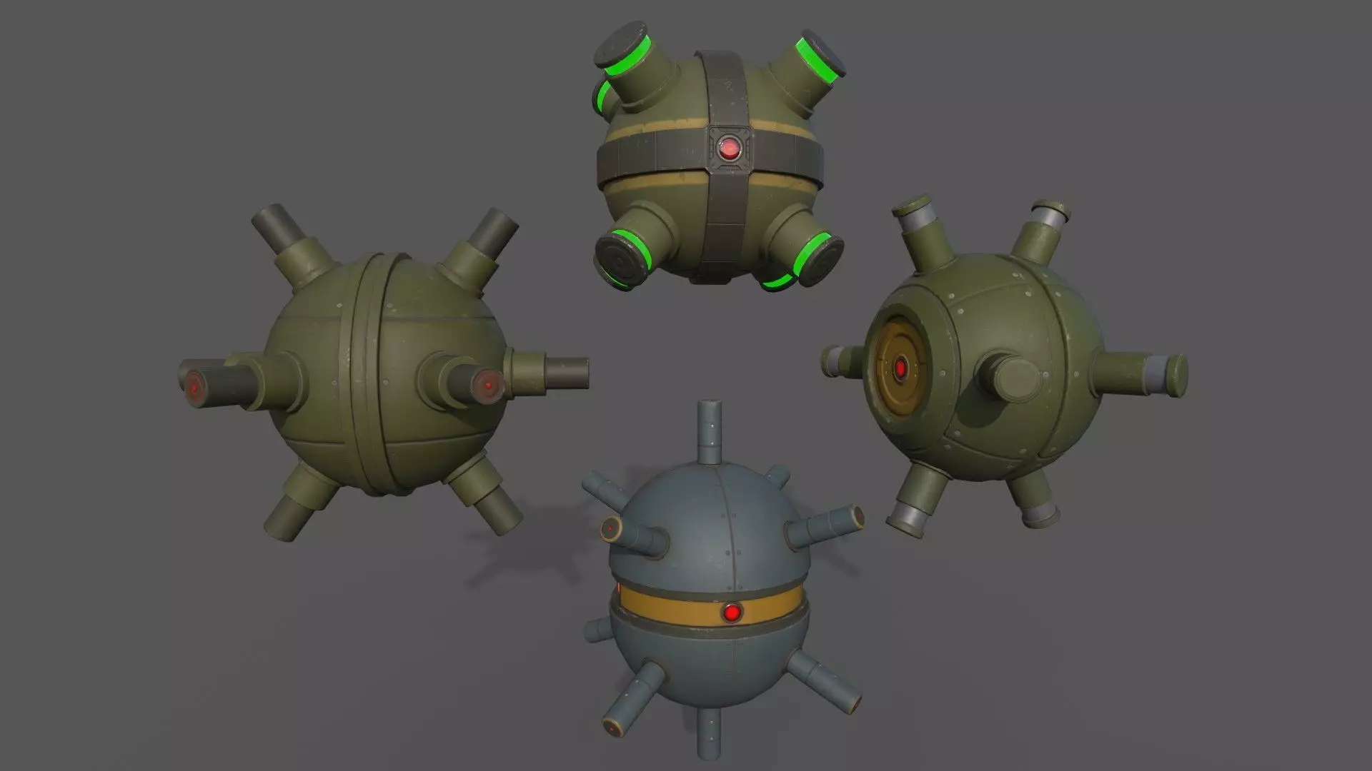 Welcome! Here's a package of 3D models of Sci-fi bombs (Mines) that will suit various space-themed or science-fiction games. All models in this package are low-polygonal and optimized for use in game engines.