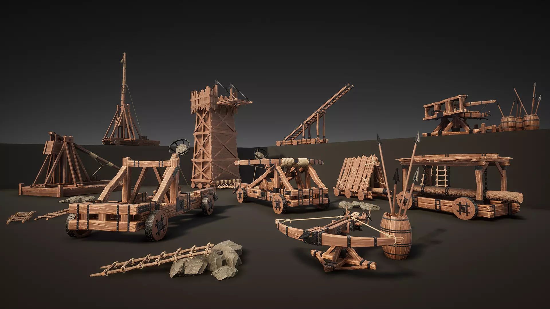 1) Ballista_01 (Skeletal Mesh with Animations+Static Mesh)2) Ballista 02 (Skeletal Mesh with Animations+Static Mesh)3) Catapult_01 (Skeletal Mesh with Animations+Static Mesh)4) Catapult_02 (Skeletal Mesh with Animations+Static Mesh)5) Ram_01 (Skeletal Mesh with Animations+Static Mesh)6) Ram_02 (Skeletal Mesh with Animations+Static Mesh)7) Siege_Tower (Skeletal Mesh with Animations+Static Mesh)8) Wheel_Ladder (Skeletal Mesh with Animations+Static Mesh)9) Trebushet_Movable (Skeletal Mesh with Animations+Static Mesh)10) Trebushet_Static (Skeletal Mesh with Animations+Static Mesh)+Projectiles: Arrow for Ballista_01/Arrow for Ballista_02/ Stones for Catapults and Trebushets
