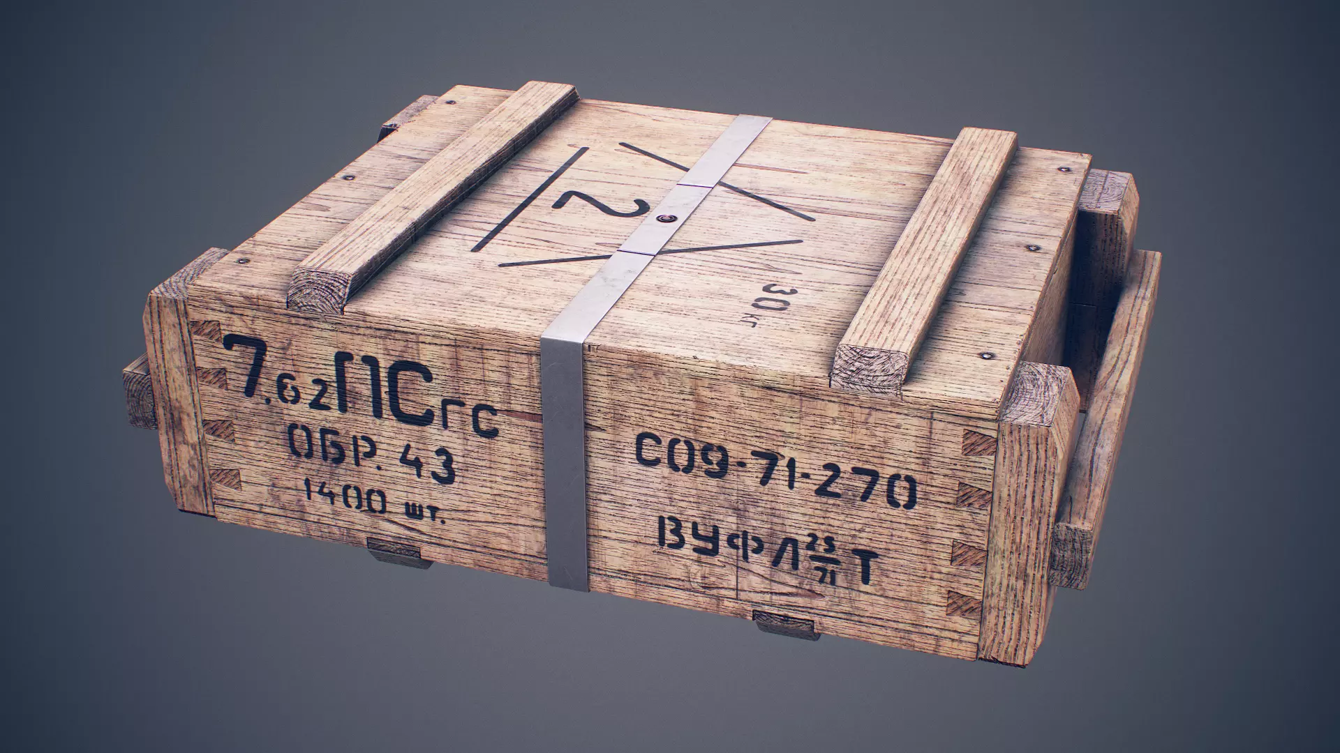 Low poly and textured model of a 70s style Soviet crate for 7.62 ammunition.