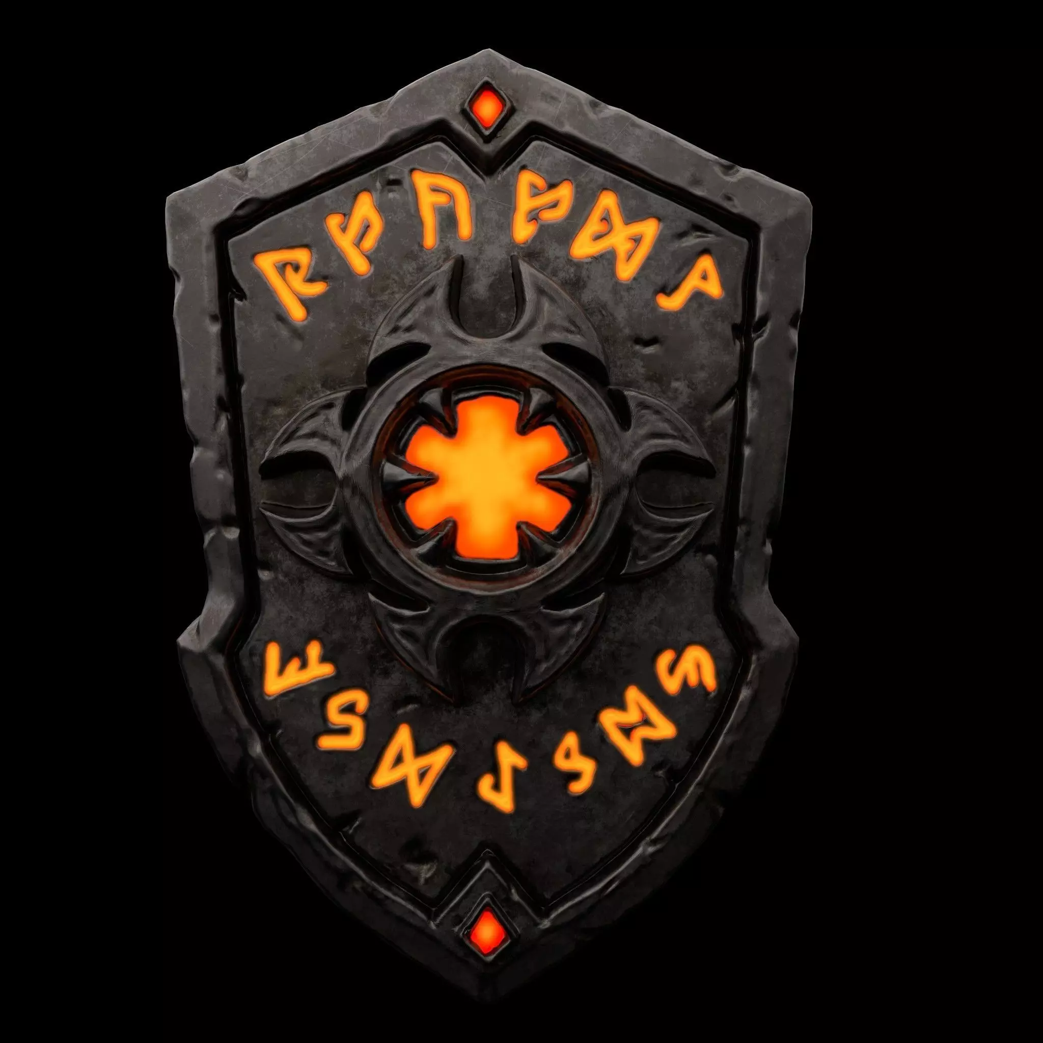 A high-quality, stylized dark fantasy shield featuring glowing ancient runes and a weathered metallic finish. This asset has been meticulously optimized from a high-poly sculpt to a low-poly mesh, making it perfect for RPGs, dungeon crawlers, or battle-centric games.