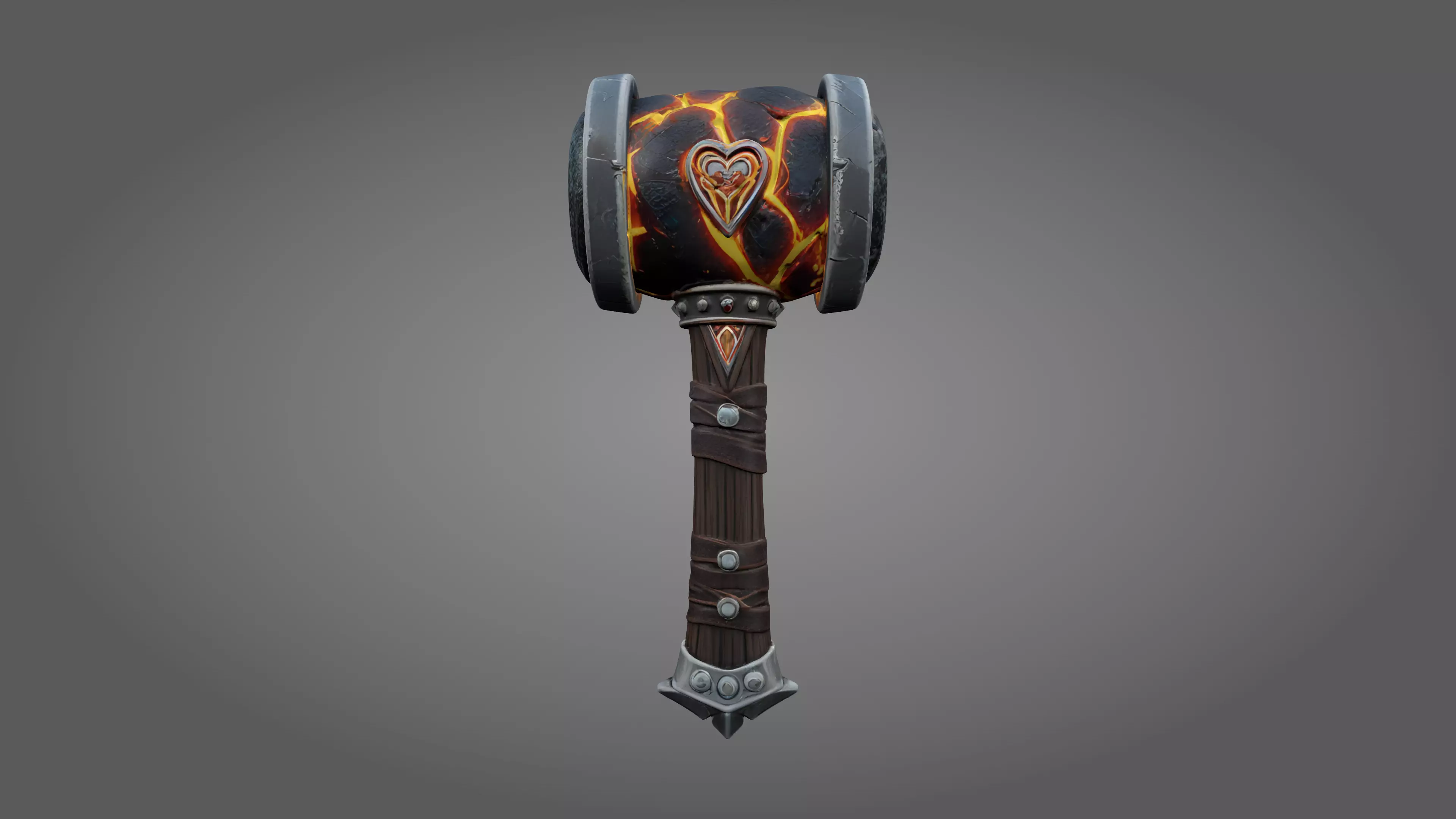 High-quality stylized Warhammer featuring a molten lava core and a glowing heart emblem. This 3D model is meticulously crafted for game engines, fantasy RPGs, and high-end visual projects. Created and optimized in Blender 5.1, it combines volcanic stone textures with glowing magma effects.