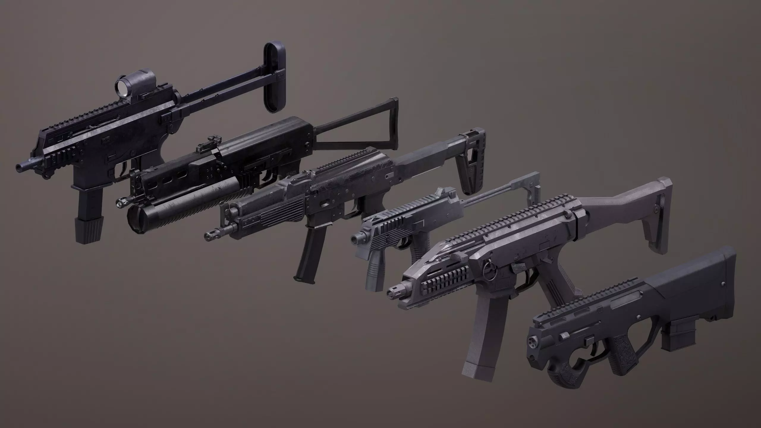 PBR textured low-poly High detailed Submachinegun set. Contains 6 Submachuneguns Rigged and ready to be used in games.