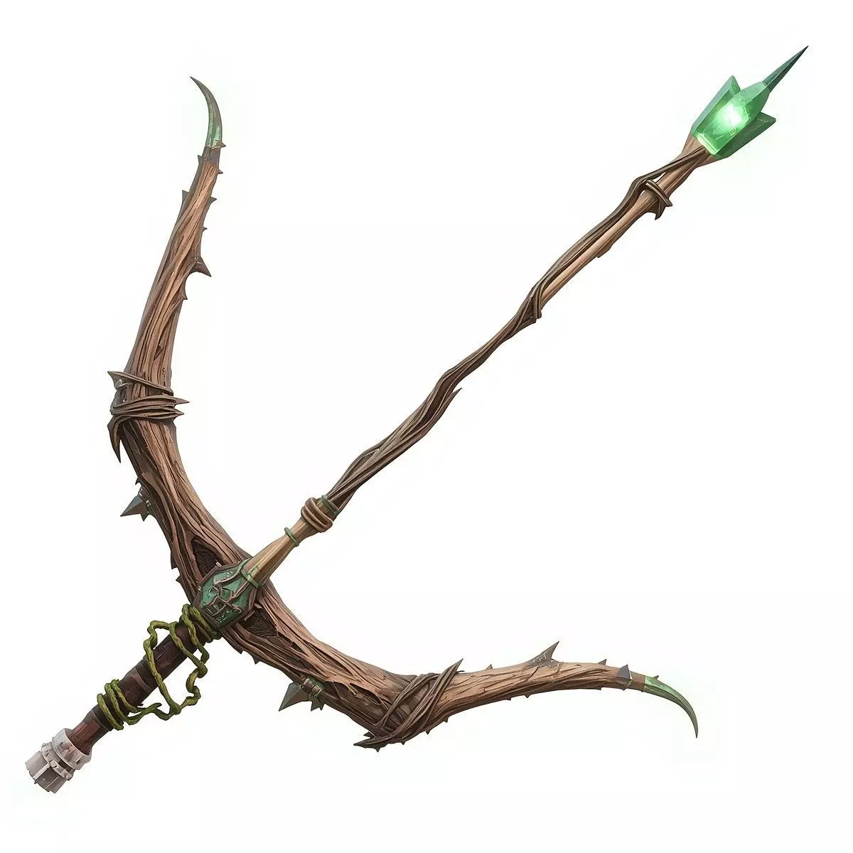 Emerald Crystal Focus: A large, glowing green crystal is embedded in the upper tip, serving as a visual focal point and suggesting magical capabilities (enchanted arrows).
