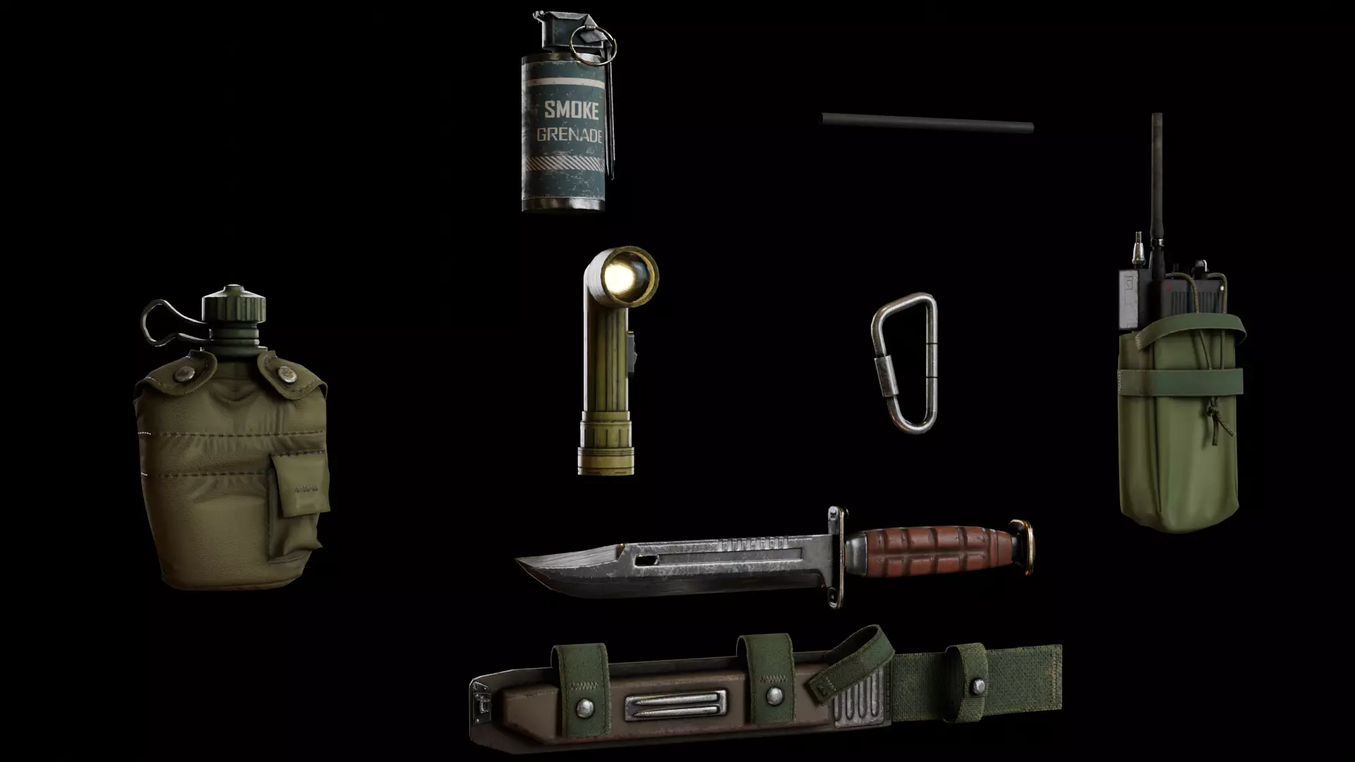 A game ready high quality 3D bundle of essential military equipment, featuring a tactical radio, smoke grenade, water bottle, combat knife, flashlight, and snap hook.this tactical loadout is all in 1 4 k