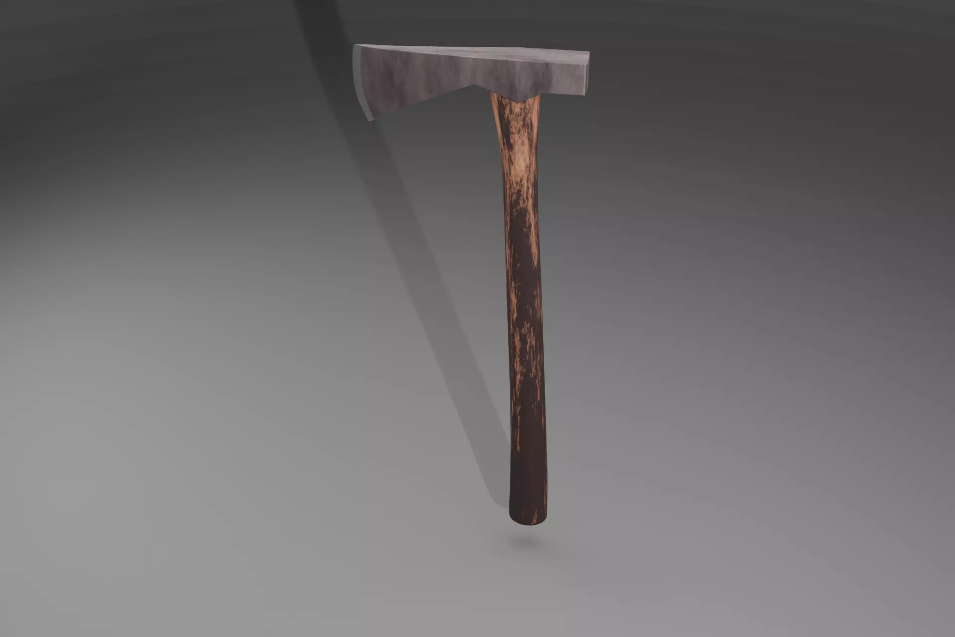 A realistic 3D axe model featuring a worn metal blade and a weathered wooden handle. The model is designed with attention to surface detail, giving it a rugged, used appearance suitable for games, cinematic renders, or environment props.