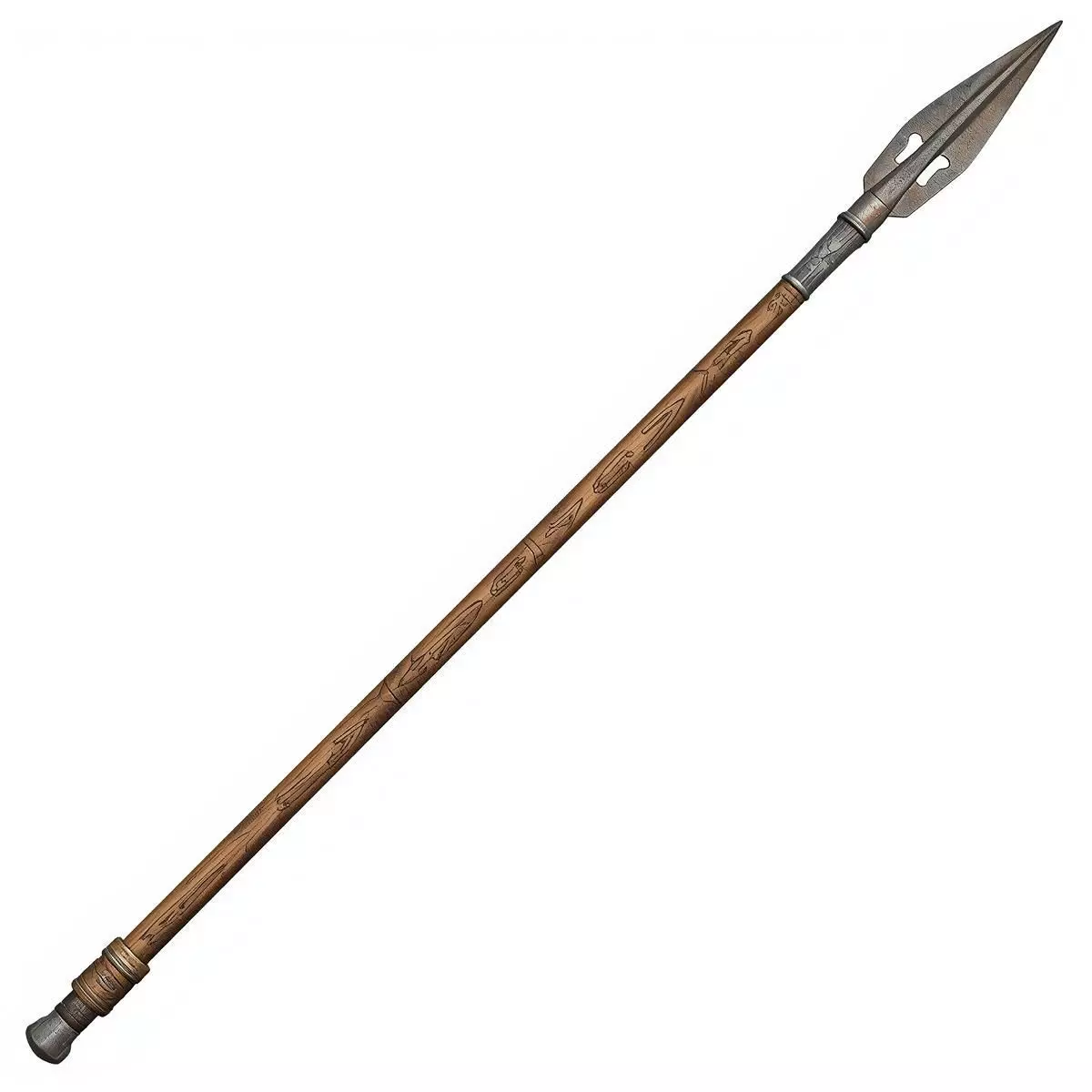 It is equipped with a broad, forged iron spearhead characterized by a leaf-shaped blade, reinforced central ridge, and decorative geometric perforations near the socket.