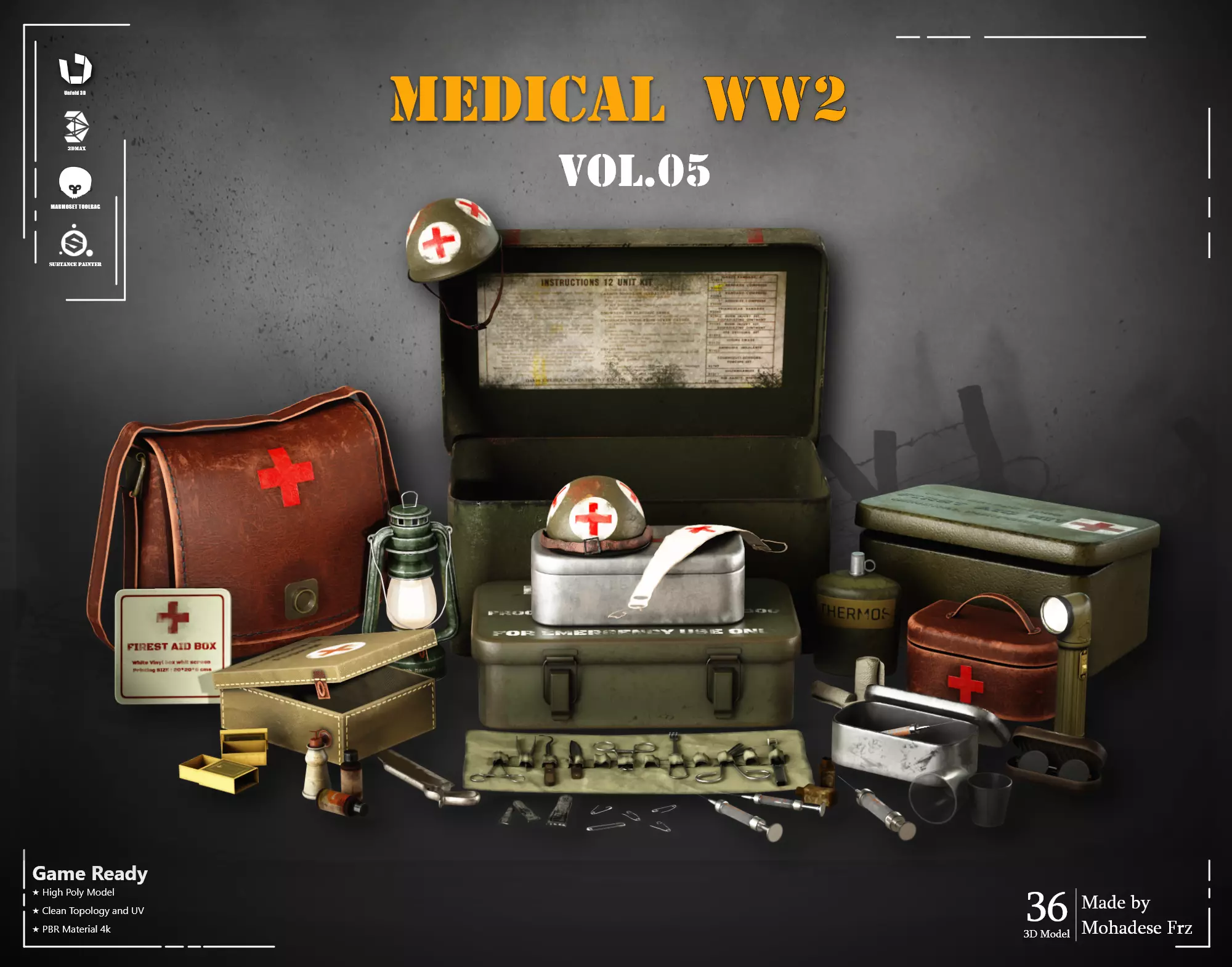 36 custom models of World War II military medical equipment for use in 3D projects that are made with the highest quality and detail.In this product, modeling in 3dsmax software and material processing in Substance Painter software and rendering and animation inside Marmoset Toolbag have been done.All objects have quad topology and clean UVPolygons of the whole collection: 376 thousand polygons