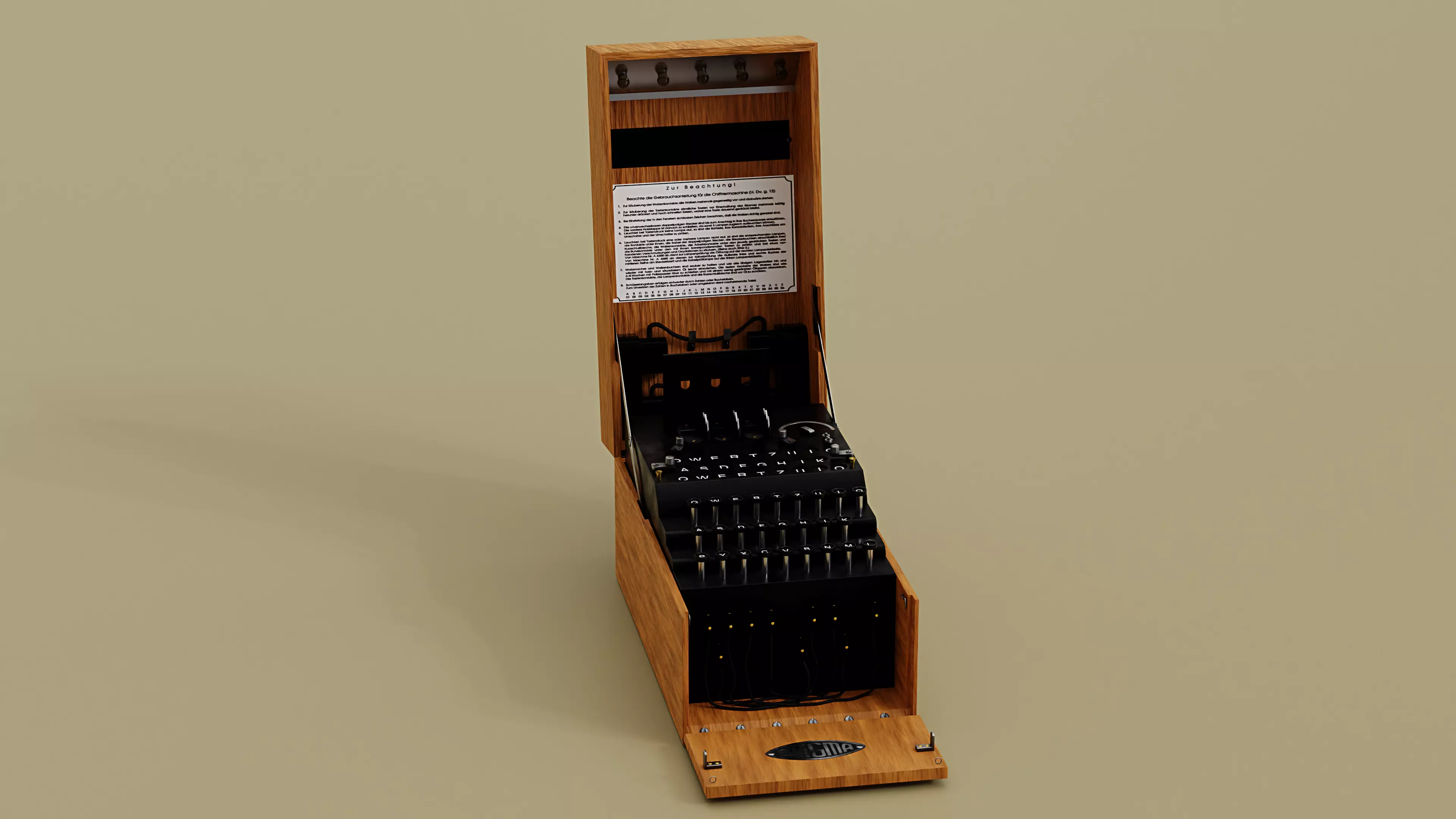 The Enigma machine is a cipher device developed and used in the early- to mid-20th century to protect commercial, diplomatic, and military communication. It was employed extensively by Nazi Germany during World War II, in all branches of the German military. The Enigma machine was considered so secure that it was used to encipher the most top-secret messages. The Enigma has an electromechanical rotor mechanism that scrambles the 26 letters of the alphabet. In typical use, one person enters text on the Enigma's keyboard and another person writes down which of the 26 lights above the keyboard illuminated at each key press. If plain text is entered, the illuminated letters are the ciphertext. Entering ciphertext transforms it back into readable plaintext. The rotor mechanism changes the electrical connections between the keys and the lights with each keypress.