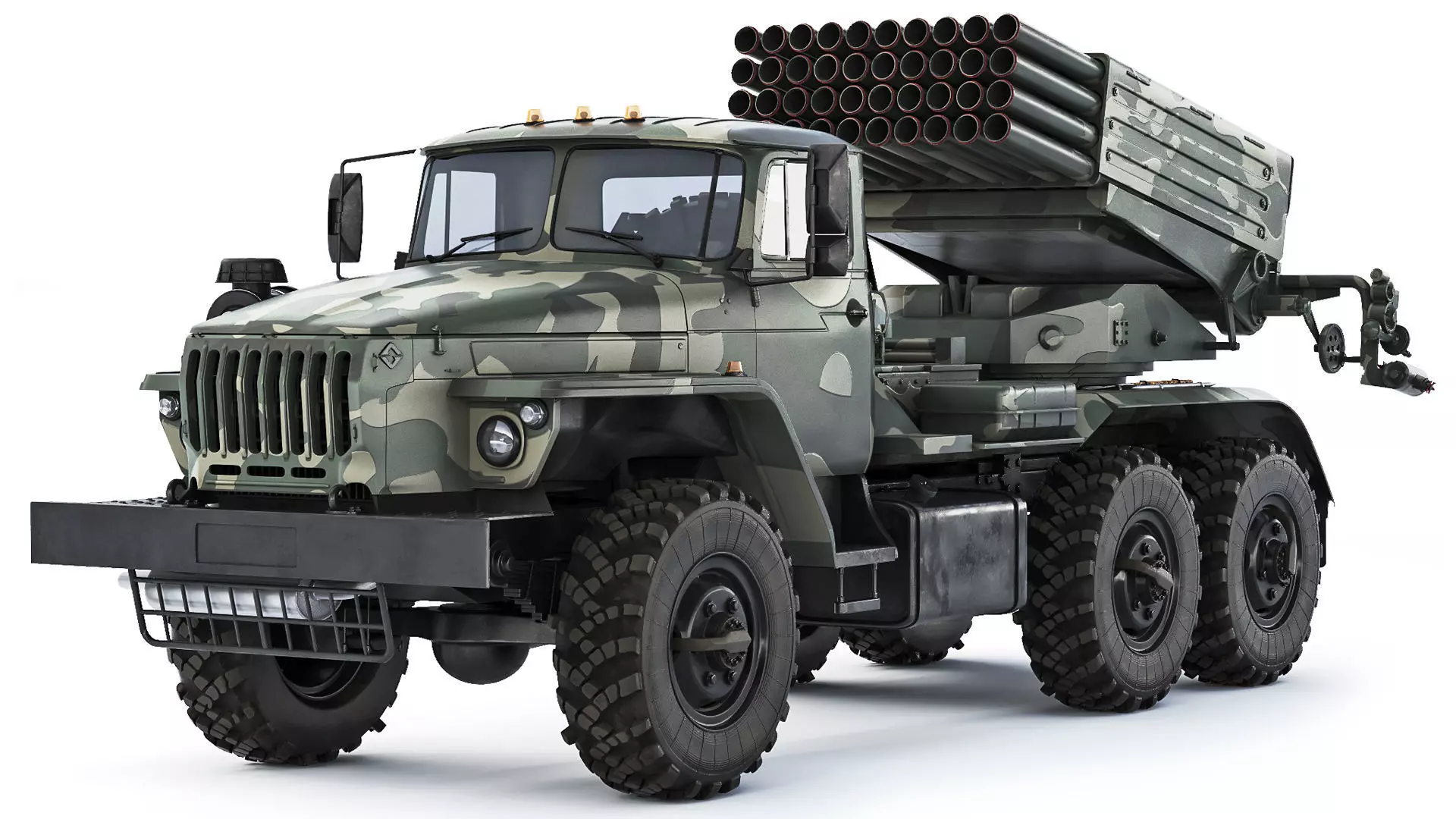 BM-21 Grad (GRAU Index 9K51) is a multiple launch rocket system of 122 mm caliber. 2B17 - BM-21-1 RSZV 9K51 combat vehicle on the Ural-4320 chassis. The main elements are prepared for TurboSmooth smoothing (2 iterations). The elements of the hull, weapons, and chassis have been worked out. The launcher rotation and the angle of attack have been adjusted.
