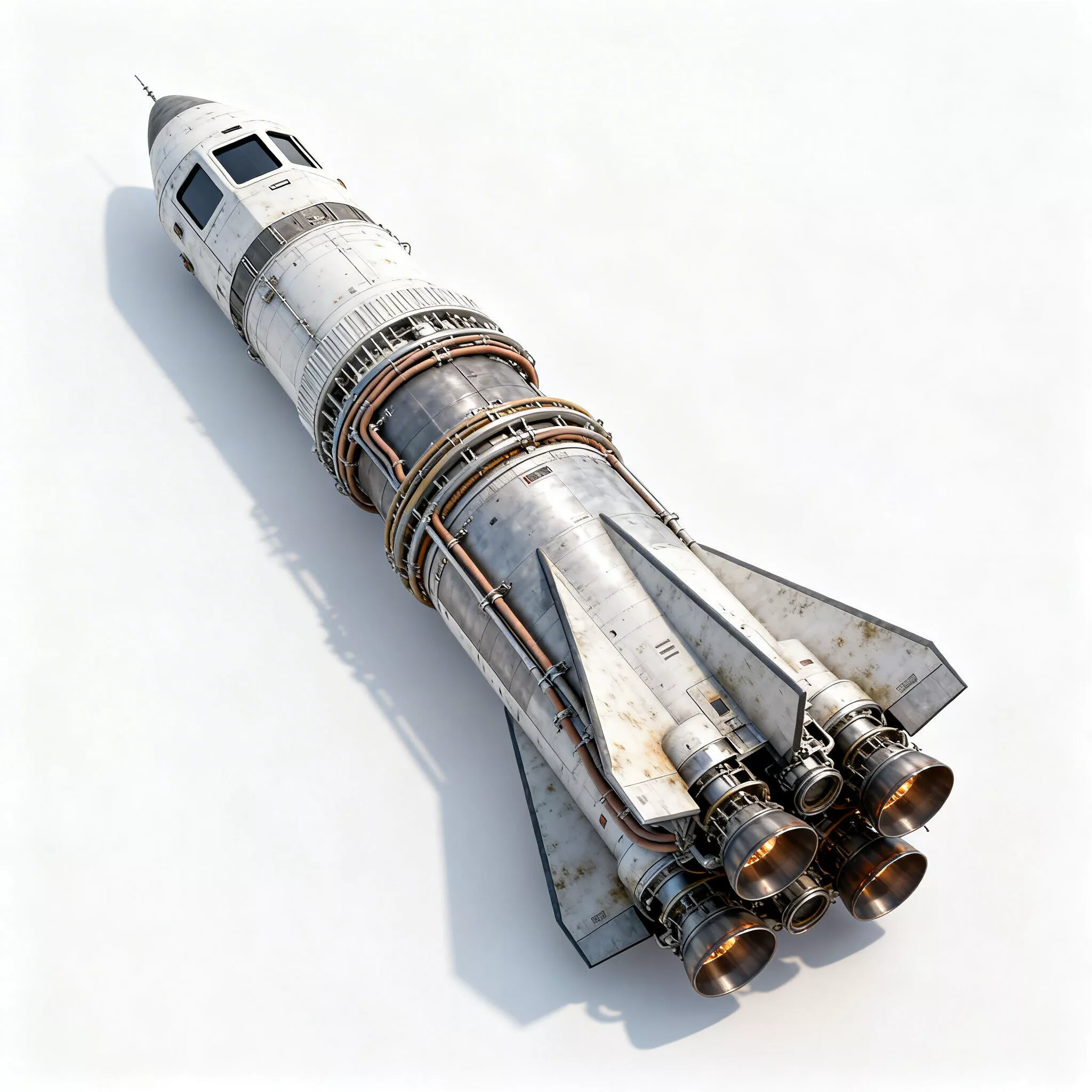 Tagsrocket space ship spacecraft realistic scifi futuristic industrial aerospace engine exploration vessel rusted weathered thruster full studio shot asset prop modular