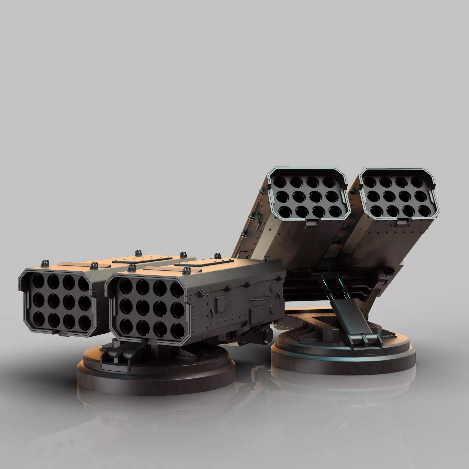 Nice model - the only request that I would make is to have the top of the base piston to be its own object. When animating the missile launcher, the top launcher will angle up and the base piston is to angle with it. The inner pipes are a separate object to extend as the top launcher rises, but the end of the base piston cannot. This part, that connects to the top launcher, needs to move as things animate. It's a minor issue, as I used Blender to chop the base piston into two objects and got the animation working.